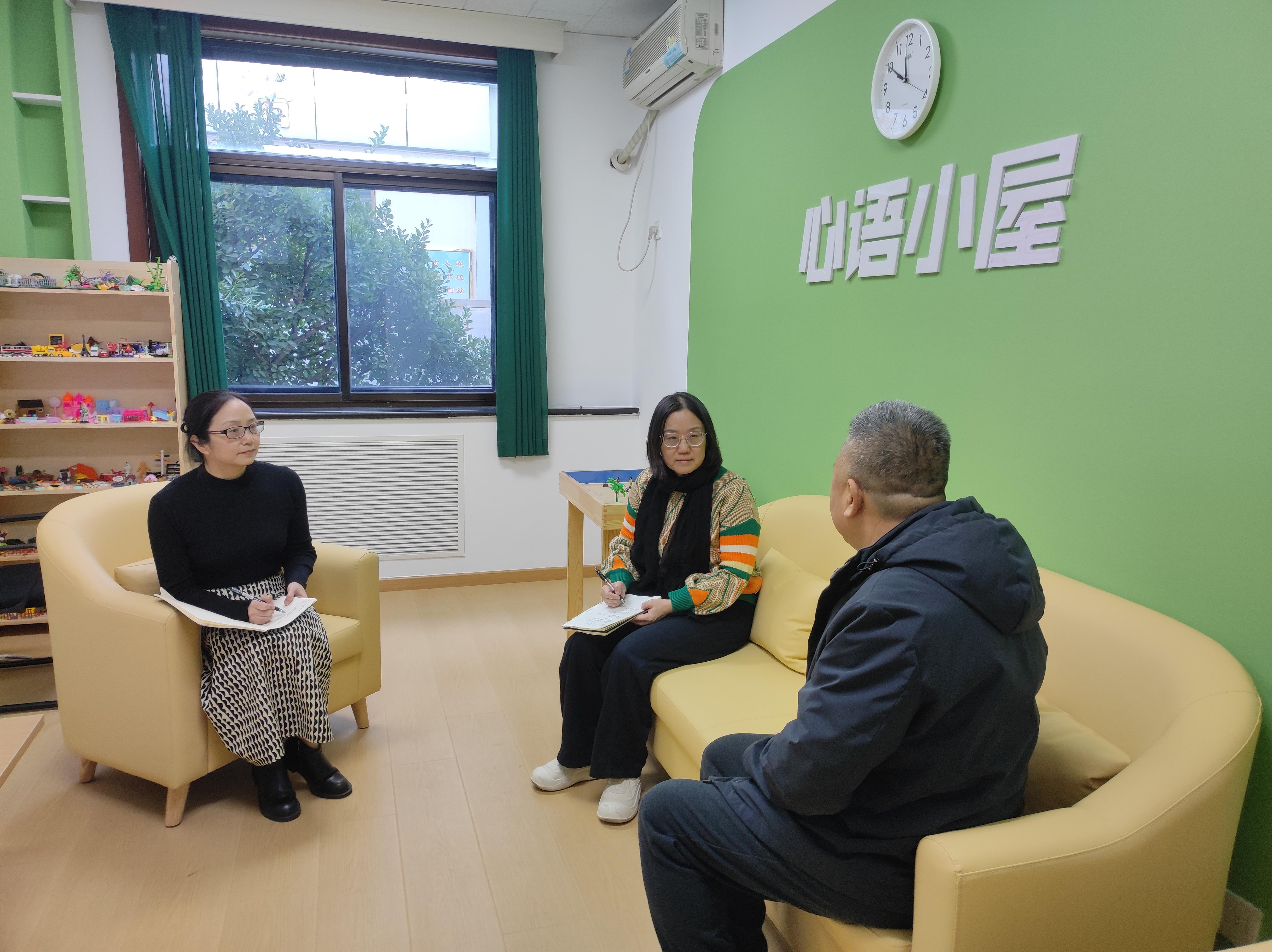 圖為綜治中心工作人員和心理咨詢(xún)師共同與咨詢(xún)?nèi)罕娚逃懠m紛解決之道。