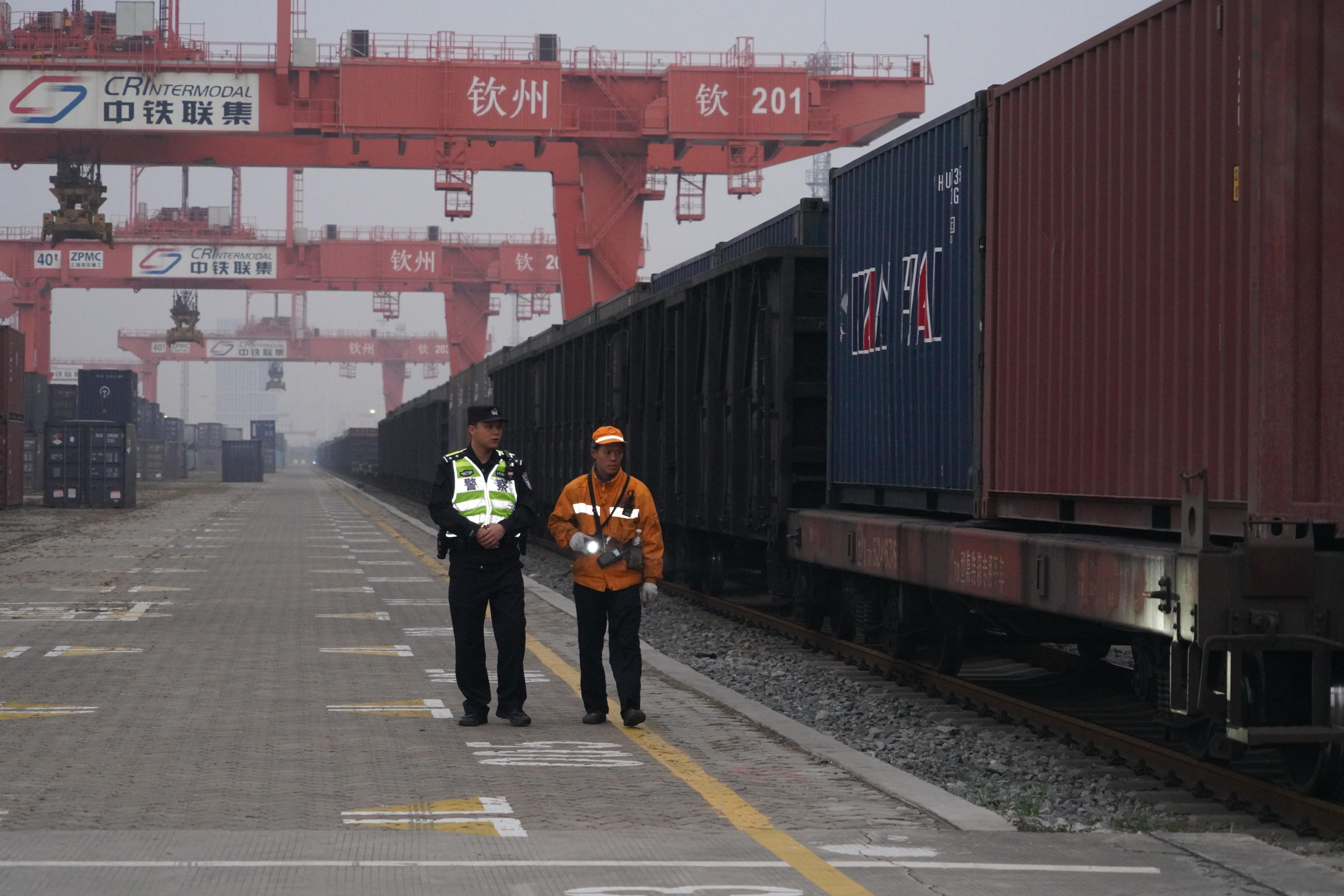 圖為李浩偉和鐵路職工檢查貨場。陳大鵬 攝
