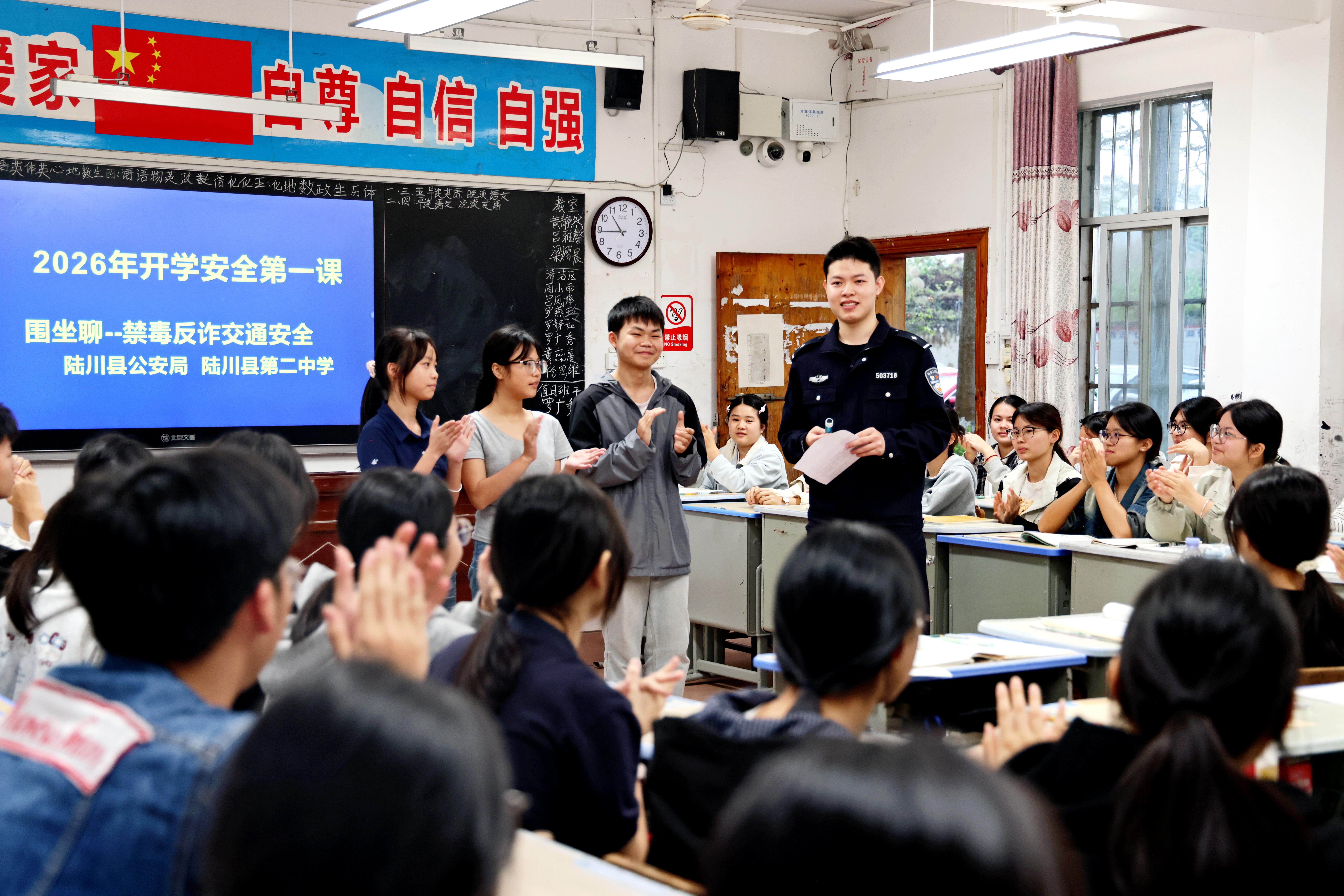 3月2日,春季開學(xué)首日,廣西壯族自治區(qū)玉林市陸川縣公安局走進轄區(qū)學(xué)校,通過案例講解、互動問答等形式,向?qū)W生們普及禁毒、反詐及交通安全知識,為新學(xué)期校園安全筑牢防線。