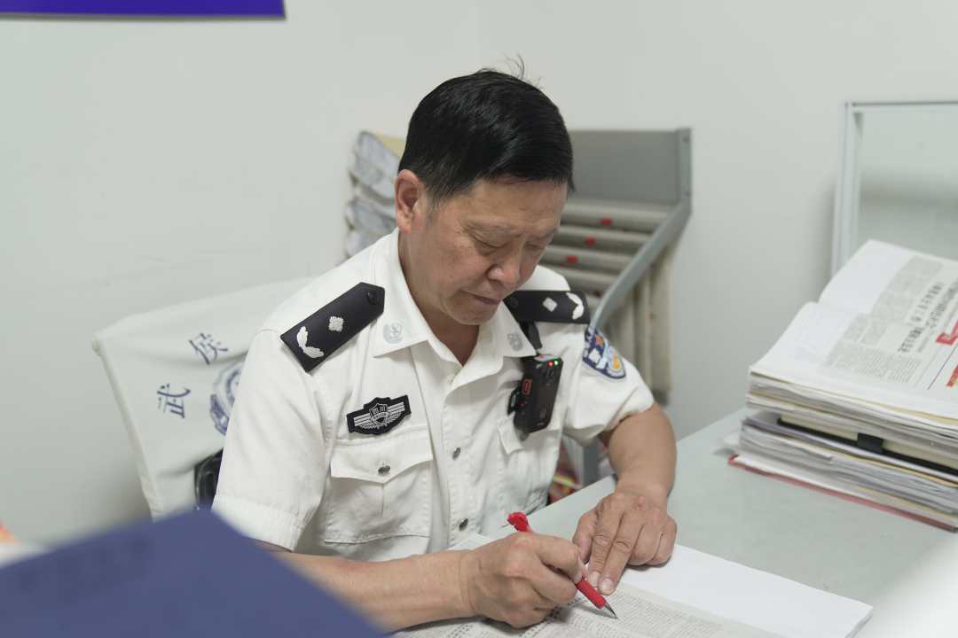 每天早會前,所上的老“國優(yōu)”、社區(qū)警務隊民警郭學彬在辦公桌前翻看工作筆記本,本上認認真真手寫記錄著每日工作、例會內容、重點任務、完成情況……他逐頁翻看更新,對照完成進度“銷賬”。