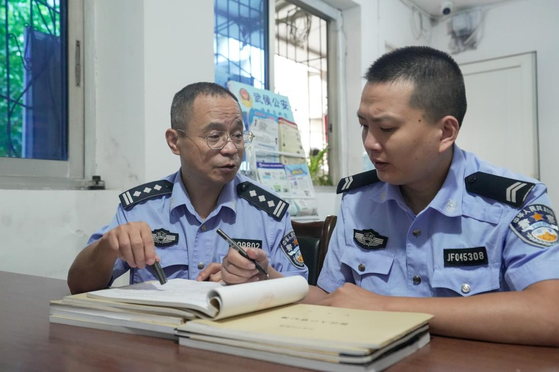 10月1日早會完畢,老葛就和徒弟萬訊開始“盤貨”,從臺賬到筆錄,一個“拎重點”、一個“記筆記”?!白錾鐓^(qū)民警,沒別的,就是勤快點、仔細(xì)點,轄區(qū)里的人口、出租房、單位,每日的警情,什么時候你不看本子不看電腦,隨時隨地都能說出來,你就真的出師了......”老葛一邊給萬訊交代著,一邊跨上了他的電瓶車,風(fēng)風(fēng)火火地趕往棕南社區(qū),開展節(jié)日期間消防安全防范宣傳。