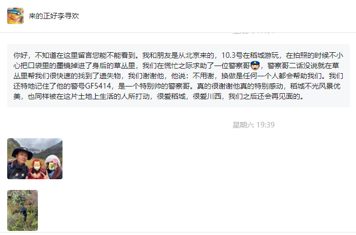 “你好,不知道在這里留言您能不能看到。我和朋友是從北京來的,10月3號日在稻城游玩,在拍照的時候不小心把口袋里的墨鏡掉進(jìn)了身后的草叢里,我們在慌忙之際求助了一位警察哥,警察哥二話沒說就在草叢里幫我們很快速的找到了遺失物,我們謝謝他,他說:不用謝,換做是任何一個人都會幫助我們。我們還特地記住了他的警號GF5414,是一個特別帥的警察哥。真的很謝謝他真的特別感動,稻城不光風(fēng)景優(yōu)美,也同樣被在這片土地上生活的人所打動,很愛稻城,很愛川西,我們之后還會再見面的?!?/p>