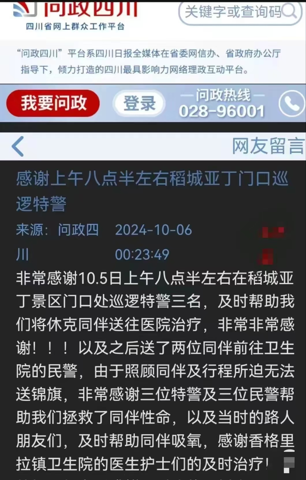“非常感謝10月5日上午8點(diǎn)半,在亞丁景區(qū)門口的三位特巡警,將我們休克的同伴及時送往醫(yī)院治療。由于照顧同伴及行程所迫無法送錦旗,但這份恩情我們永遠(yuǎn)銘記在心!”10月6日,一封來自游客的感謝信投遞在“問政四川”平臺上,信中充滿了他對眾多好心人的感激之情。據(jù)稻城縣公安局特巡警大隊(duì)副大隊(duì)長四郎澤仁介紹,10月5日,亞丁景區(qū)迎來眾多游客。我和隊(duì)員們正在景區(qū)門口的執(zhí)勤點(diǎn)位上執(zhí)勤,確保游客的安全和秩序。突然,聽到一陣急促的呼救聲,我們立刻循聲跑去,只見一名女游客倒在地上,身體不停地發(fā)抖,已經(jīng)陷入休克狀態(tài)?!懊鎸@突如其來的緊急情況,我們按照日常養(yǎng)成的急救常識,立即對游客進(jìn)行了初步判斷,根據(jù)其癥狀和表現(xiàn),我們判斷是由于缺氧所導(dǎo)致的,并立即對她進(jìn)行了初步的搶救?!痹诔醪綋尵群螅撚慰偷那闆r雖有所緩解。于是,我和我的戰(zhàn)友們立即開辟起一條“綠色通道”,用警車將患者轉(zhuǎn)送至鎮(zhèn)衛(wèi)生院。為了不浪費(fèi)任何一分鐘的治療時間,到達(dá)衛(wèi)生院后特巡警隊(duì)員將患者背上,送入診療室。當(dāng)看到游客在醫(yī)生的救治下逐漸恢復(fù)意識,我們懸著的心也終于放了下來。那一刻,我們深深地感受到了作為一名警察的責(zé)任和使命。