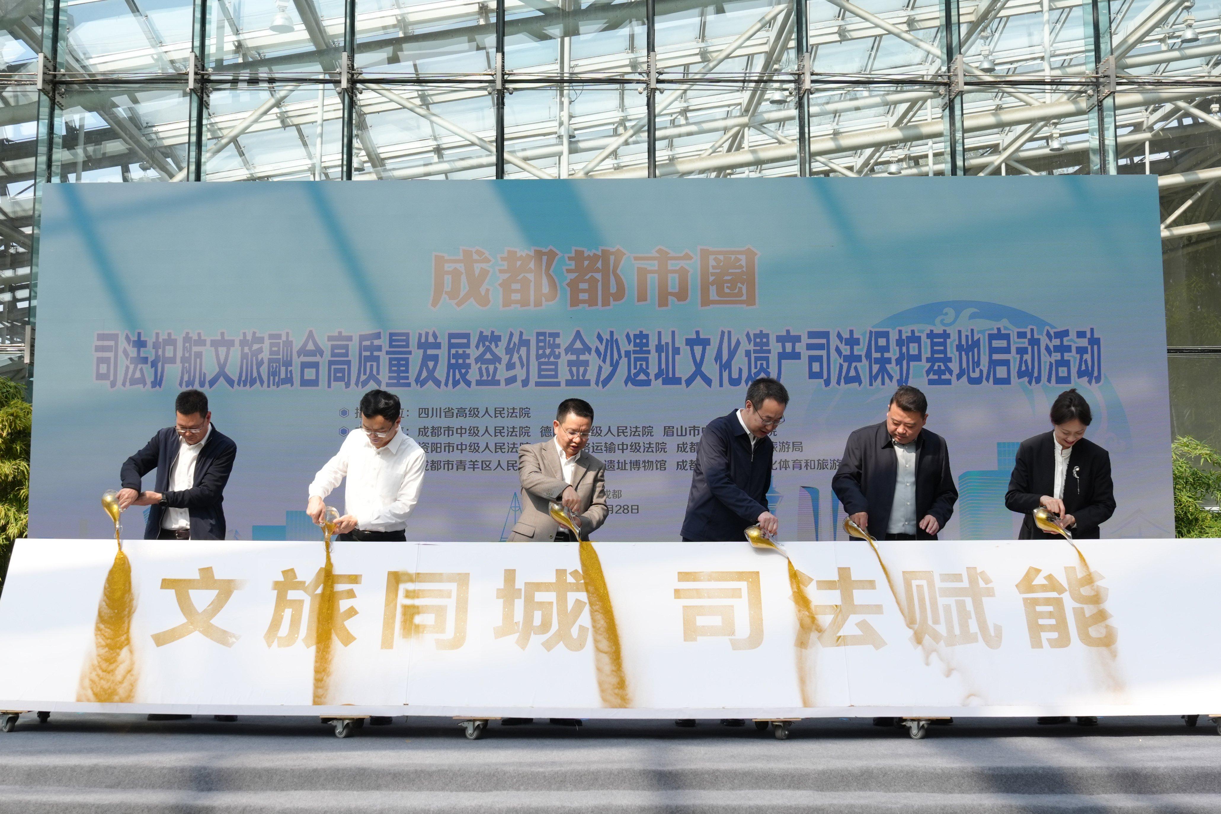 活動現(xiàn)場,四川高院副院長張能、成都中院院長楊誠、資陽中院院長馬澤波,德陽中院院長胡旭東,眉山中院院長付寶、成鐵中院院長李瑤共同為基地啟動“注能”,隨著鎏金沙被傾倒在啟動臺面板上,“文旅同城 司法賦能”緩緩顯形。