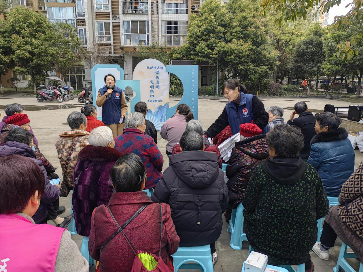 活動開場,主持人采訪了現(xiàn)場觀眾清明祭掃相關問題,大家紛紛發(fā)表看法。德源司法所所長唐進介紹了清明節(jié)掃墓祭祖、踏青、吃青團等習俗,向現(xiàn)場及觀看直播的居民分享了網(wǎng)絡祭掃、敬獻鮮花、植樹踏青、絲帶寄語等文明祭掃方式。隨后唐所長“以案說法”,結合《中華人民共和國消防法》《森林防火條例》等法律法規(guī),分享了幾起明火祭祀引發(fā)嚴重后果的典型案例,并將文明祭掃法律知識融入有獎問答,為參與互動的居民送上法治周邊禮品。