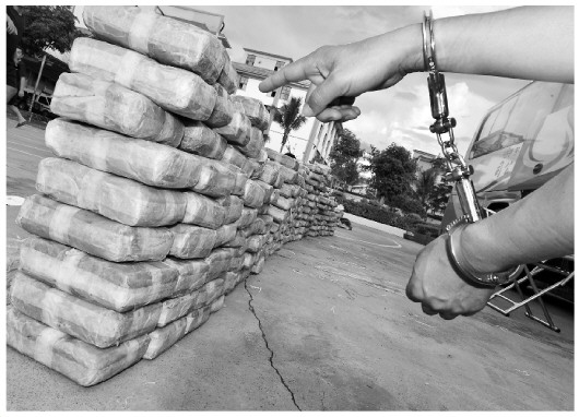 6月7日,云南西雙版納邊境管理支隊破獲一起特大運輸毒品案,在一輛大巴車上查獲毒品可疑物139.774公斤。圖為嫌疑人指認所運輸?shù)亩酒房梢晌?。法制日報記?石飛法制網(wǎng)通訊員 韋立鵬 攝
