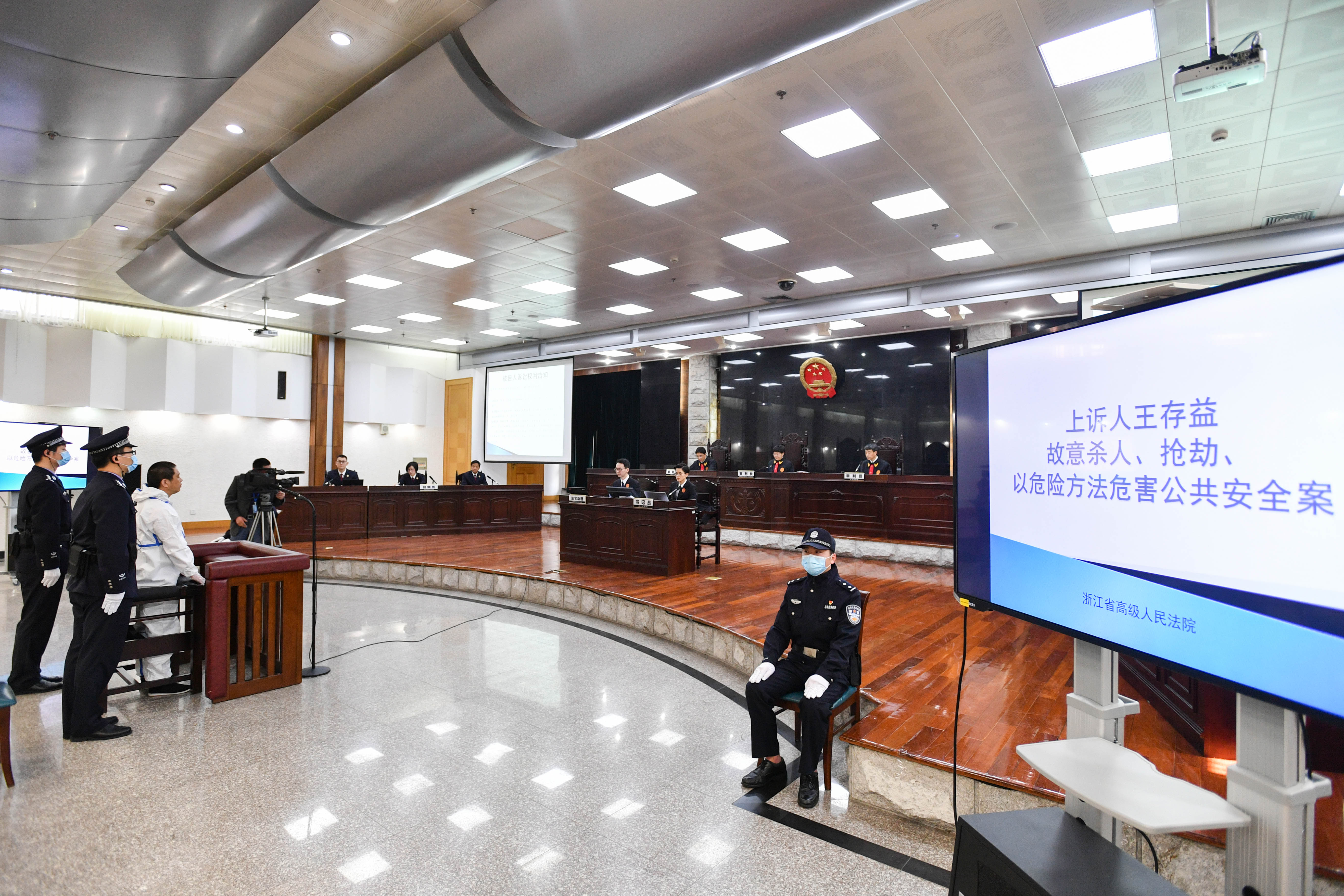 今年4月17日上午,浙江省高級人民法院二審公開開庭審理了王存益故意殺人、搶劫、以危險方法危害公共安全案。浙江省人民檢察院檢察長、二級大檢察官賈宇與檢察員黃茜霞、李明出庭履行職務(wù),浙江高院副院長陳志君擔(dān)任審判長,法官梁健、侯天柱擔(dān)任審判員,上訴人王存益及其二審辯護(hù)人出庭參加訴訟。