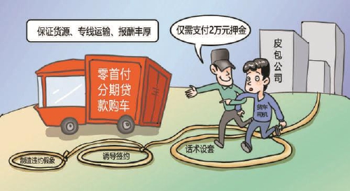 “我看公司挺正規(guī)的,這個經(jīng)理也很專業(yè),最關(guān)鍵的是,這個工資待遇算是很高的了,所以我立即就簽了合同。”小范回憶說。簽約后,根據(jù)公司要求,小范先交納了一大筆押金。原來,想要賺這份“高薪”,首先要根據(jù)簽約年限交給公司一筆1萬元至2萬元不等的押金。由于小范沒有自己的貨車,張經(jīng)理便要求他交納2萬元的押金,隨后幫他聯(lián)系4S店零首付分期貸款購買車輛,并承諾小范“如果以后不再跑物流,隨時可以把車子過戶到公司名下,不再還貸”。