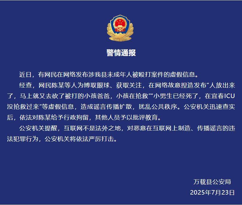 7月23日下午,萬載縣公安局發(fā)布警情通報稱,網(wǎng)民陳某等人為博取眼球、獲取關注,在網(wǎng)絡故意捏造發(fā)布“小男生已經(jīng)死了,在宜春ICU沒搶救過來”等虛假信息,公安機關依法對陳某給予行政拘留,其他人員予以批評教育。