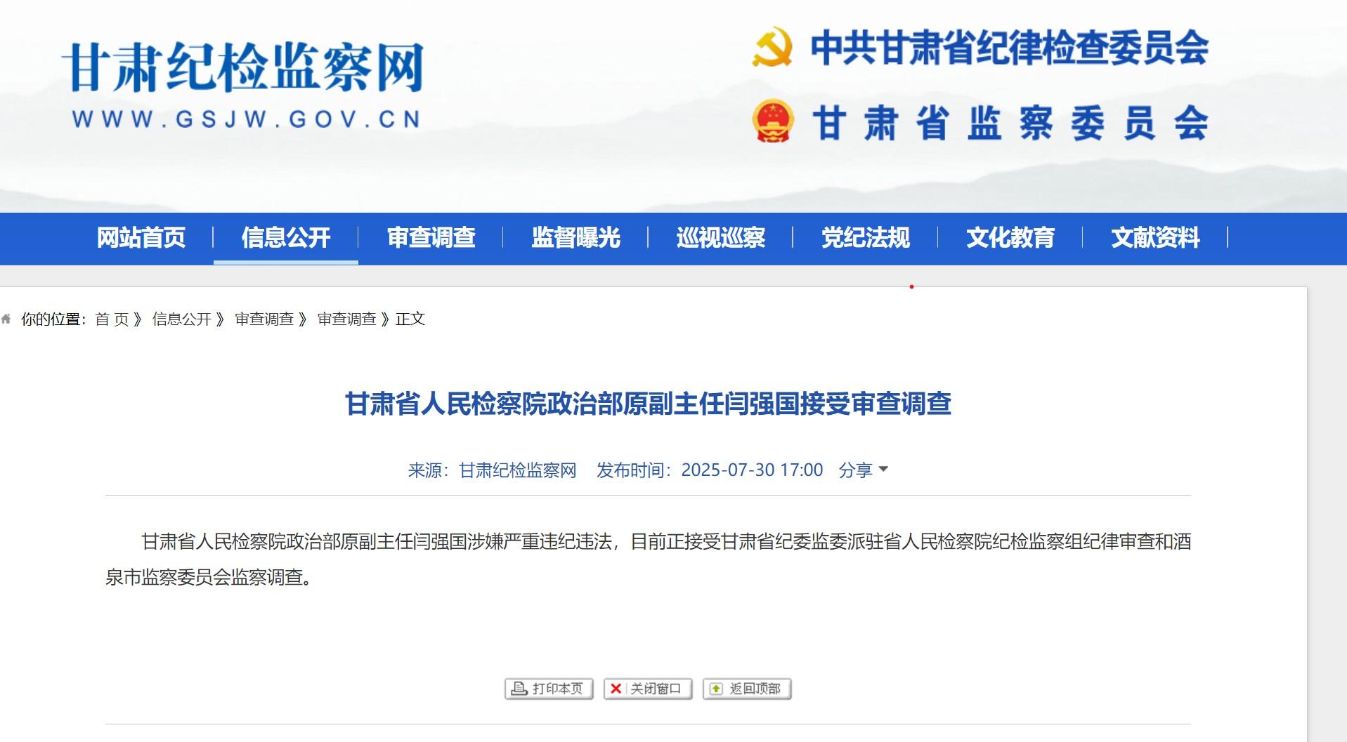 據(jù)甘肅紀檢監(jiān)察網(wǎng)7月30日消息,甘肅省人民檢察院政治部原副主任閆強國涉嫌嚴重違紀違法,目前正接受甘肅省紀委監(jiān)委派駐省人民檢察院紀檢監(jiān)察組紀律審查和酒泉市監(jiān)察委員會監(jiān)察調查。