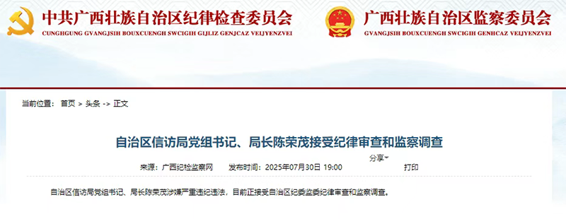 廣西紀(jì)檢監(jiān)察網(wǎng)7月30日下午發(fā)布消息:自治區(qū)信訪局黨組書記、局長陳榮茂涉嫌嚴(yán)重違紀(jì)違法,目前正接受自治區(qū)紀(jì)委監(jiān)委紀(jì)律審查和監(jiān)察調(diào)查。
