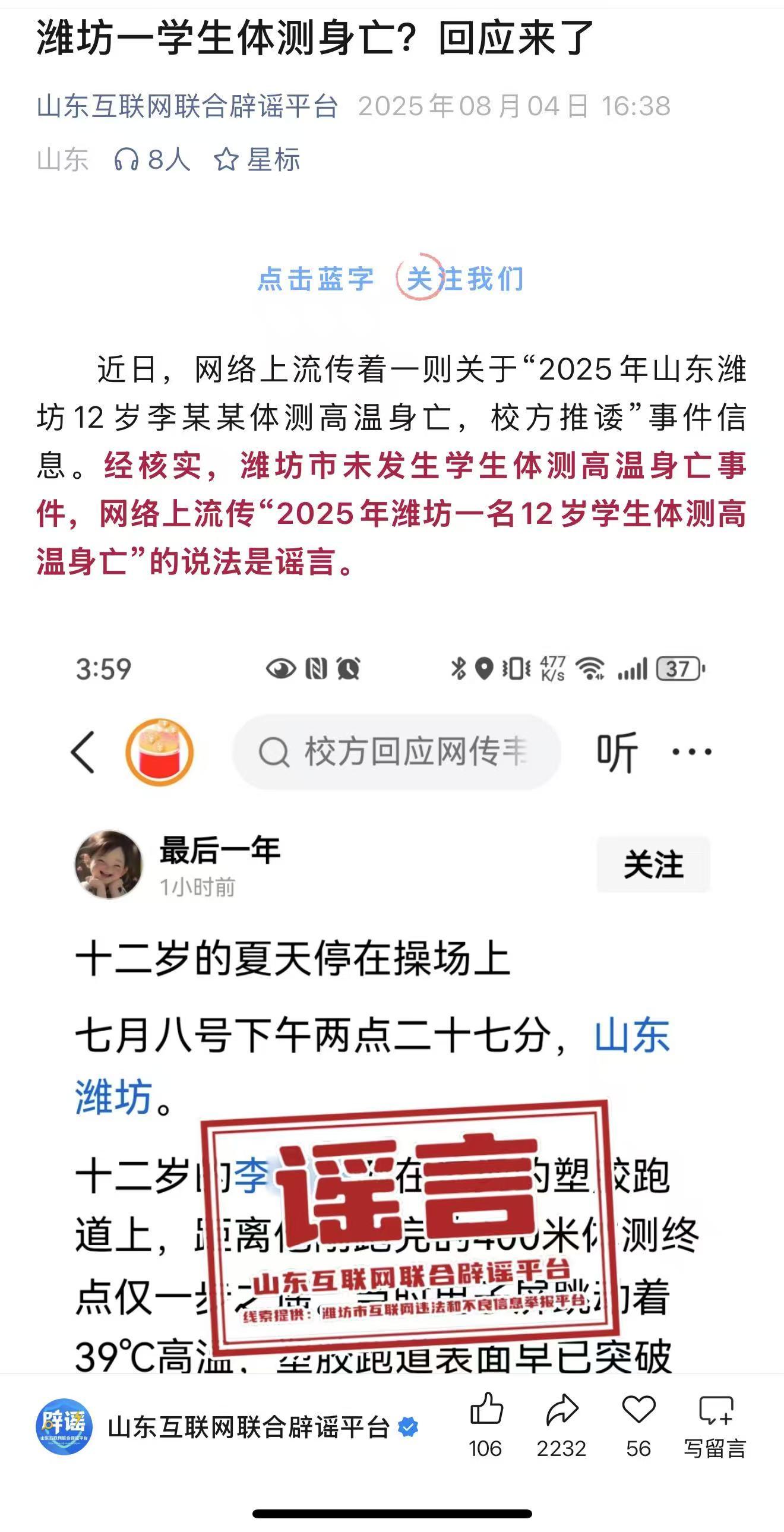 記者注意到,8月4日下午,山東互聯(lián)網(wǎng)聯(lián)合辟謠平臺發(fā)布辟謠信息:近日,網(wǎng)絡(luò)上流傳著一則關(guān)于“2025年山東濰坊12歲李某某體測高溫身亡,校方推諉”事件信息。經(jīng)核實,濰坊市未發(fā)生學(xué)生體測高溫身亡事件,網(wǎng)絡(luò)上流傳“2025年濰坊一名12歲學(xué)生體測高溫身亡”的說法是謠言。