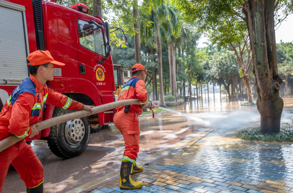 郁江2025年第2號洪水洪峰已于10月9日晚通過廣西壯族自治區(qū)南寧城區(qū)河段。10月11日上午,邕江水位逐漸回落,洪水逐漸消退的區(qū)域滯留了大面積淤泥,南寧市消防救援支隊(duì)聞令而動(dòng),嚴(yán)格按照“水退人進(jìn)、分片推進(jìn)”原則,科學(xué)調(diào)配力量,出動(dòng)消防車,攜水槍、水帶及手抬機(jī)動(dòng)消防泵等專業(yè)裝備趕赴清淤現(xiàn)場,打響災(zāi)后恢復(fù)攻堅(jiān)戰(zhàn)。