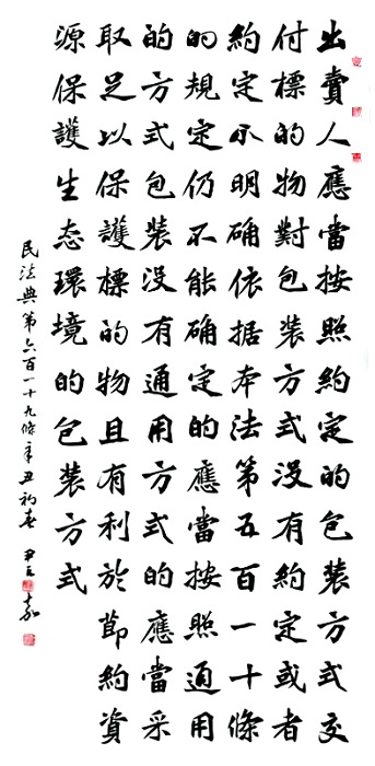 民法典第六百一十九條 出賣人應當按照約定的包裝方式交付標的物。對包裝方式?jīng)]有約定或者約定不明確,依據(jù)本法第五百一十條的規(guī)定仍不能確定的,應當按照通用的方式包裝;沒有通用方式的,應當采取足以保護標的物且有利于節(jié)約資源、保護生態(tài)環(huán)境的包裝方式。