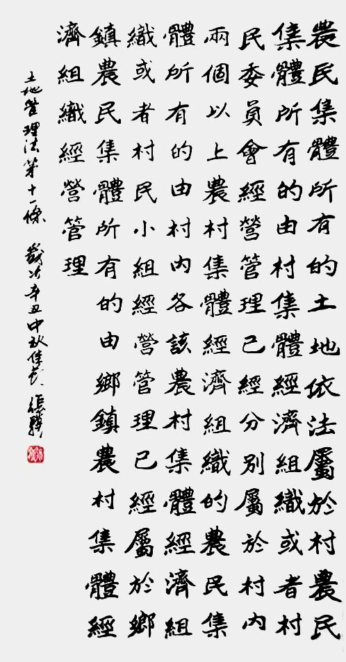 繼1600余位書法家參與書寫《中華人民共和國(guó)民法典》全部1260條法條之后,法治日?qǐng)?bào)社聯(lián)合自然資源部法規(guī)司、自然資源部書畫研究會(huì)和北京昌平書法家協(xié)會(huì),將筆端對(duì)準(zhǔn)土地管理“一法一條例”,即《中華人民共和國(guó)土地管理法》和《中華人民共和國(guó)土地管理法實(shí)施條例》。