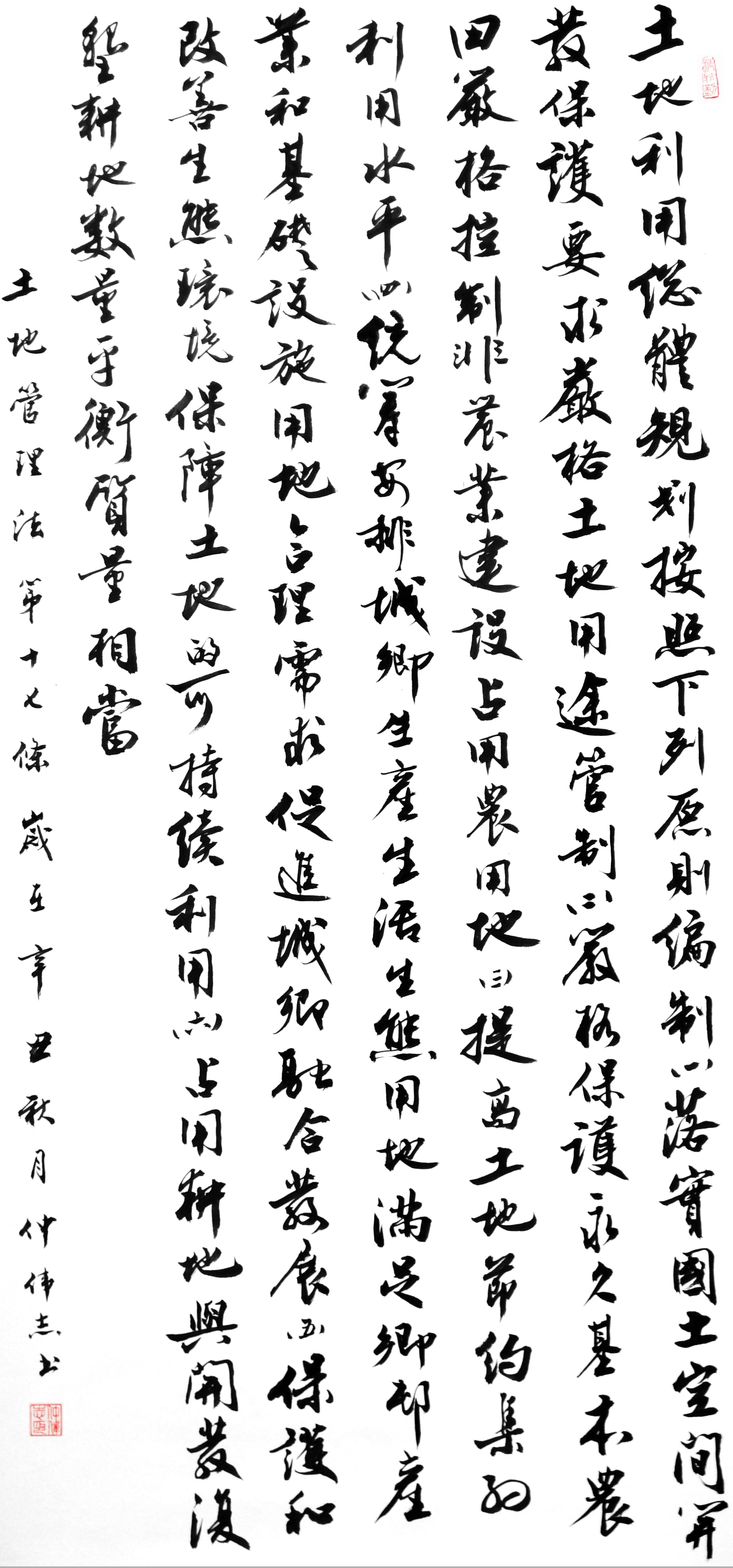 繼1600余位書(shū)法家參與書(shū)寫(xiě)《中華人民共和國(guó)民法典》全部1260條法條之后,法治日?qǐng)?bào)社聯(lián)合自然資源部法規(guī)司、自然資源部書(shū)畫(huà)研究會(huì)和北京昌平書(shū)法家協(xié)會(huì),將筆端對(duì)準(zhǔn)土地管理“一法一條例”,即《中華人民共和國(guó)土地管理法》和《中華人民共和國(guó)土地管理法實(shí)施條例》。