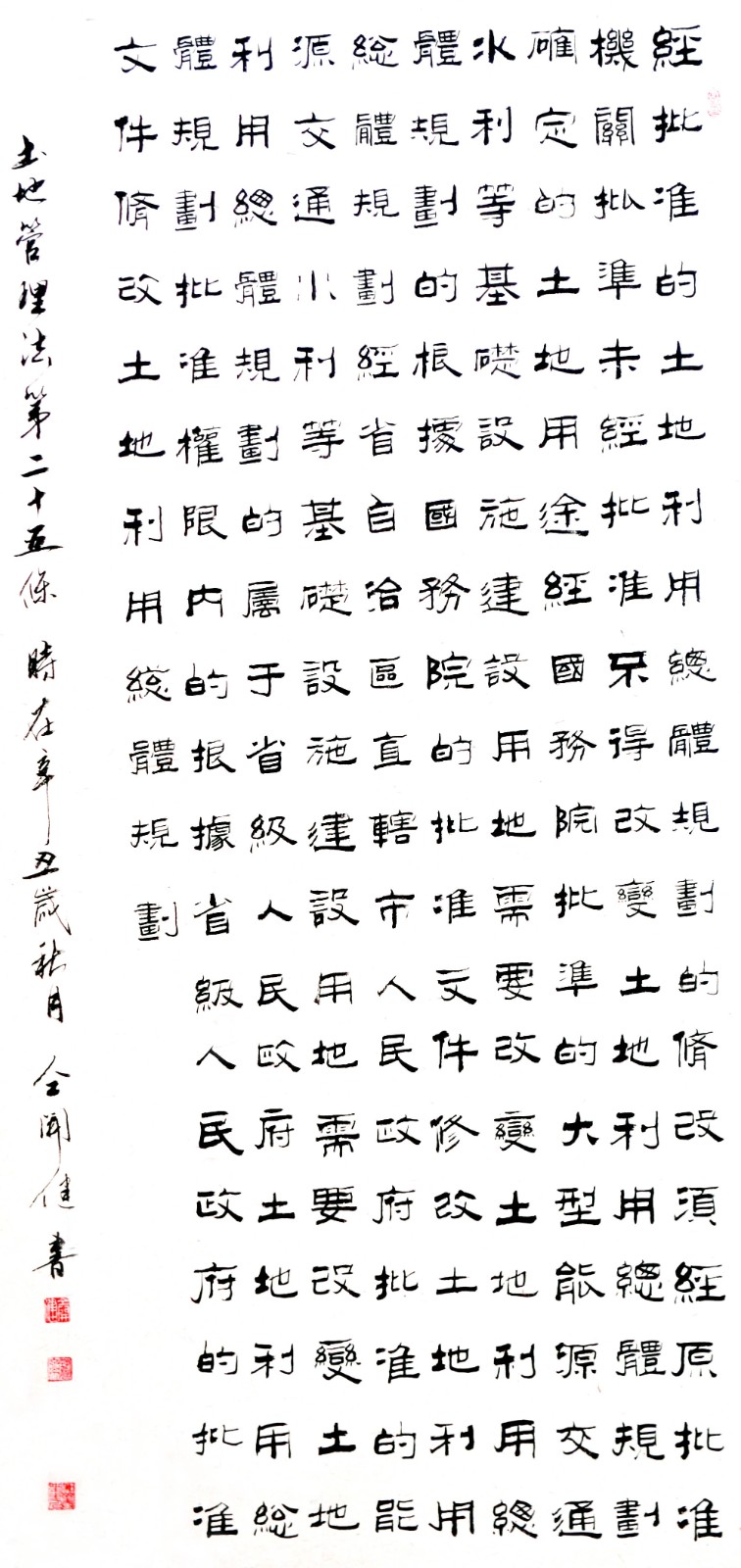 繼1600余位書(shū)法家參與書(shū)寫(xiě)《中華人民共和國(guó)民法典》全部1260條法條之后,法治日?qǐng)?bào)社聯(lián)合自然資源部法規(guī)司、自然資源部書(shū)畫(huà)研究會(huì)和北京昌平書(shū)法家協(xié)會(huì),將筆端對(duì)準(zhǔn)土地管理“一法一條例”,即《中華人民共和國(guó)土地管理法》和《中華人民共和國(guó)土地管理法實(shí)施條例》。