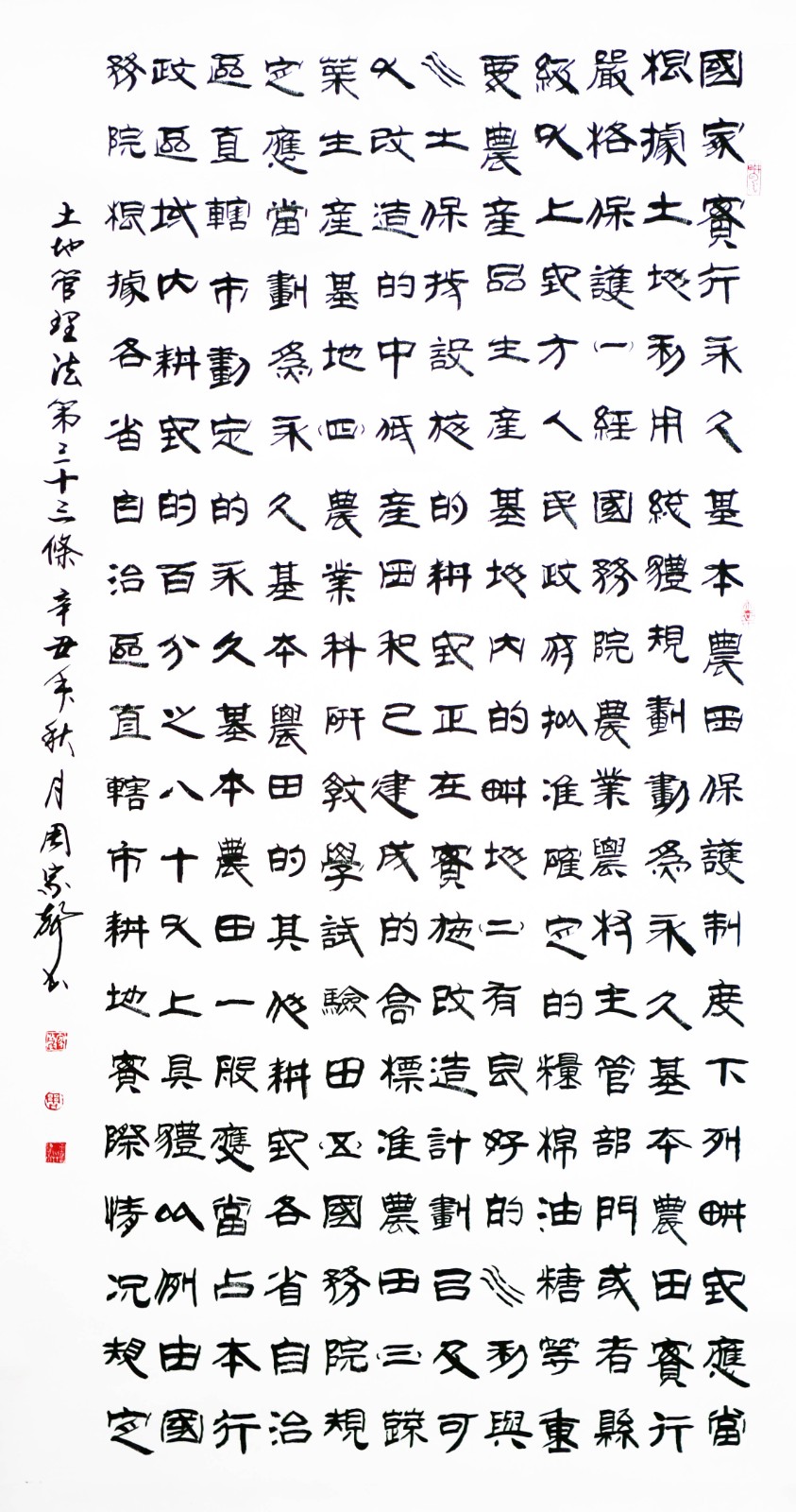 繼1600余位書法家參與書寫《中華人民共和國民法典》全部1260條法條之后,法治日報社聯合自然資源部法規(guī)司、自然資源部書畫研究會和北京昌平書法家協會,將筆端對準土地管理“一法一條例”,即《中華人民共和國土地管理法》和《中華人民共和國土地管理法實施條例》。