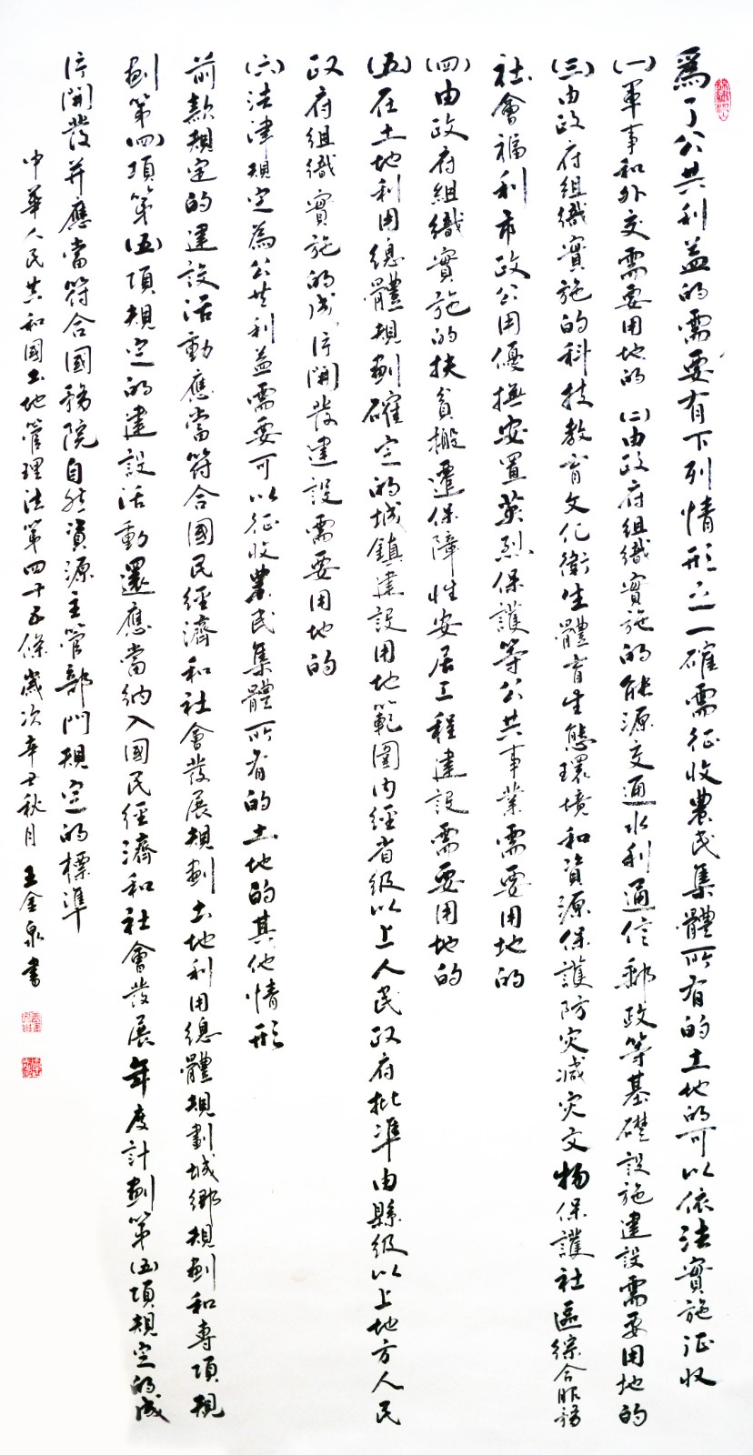 繼1600余位書(shū)法家參與書(shū)寫(xiě)《中華人民共和國(guó)民法典》全部1260條法條之后,法治日?qǐng)?bào)社聯(lián)合自然資源部法規(guī)司、自然資源部書(shū)畫(huà)研究會(huì)和北京昌平書(shū)法家協(xié)會(huì),將筆端對(duì)準(zhǔn)土地管理“一法一條例”,即《中華人民共和國(guó)土地管理法》和《中華人民共和國(guó)土地管理法實(shí)施條例》。