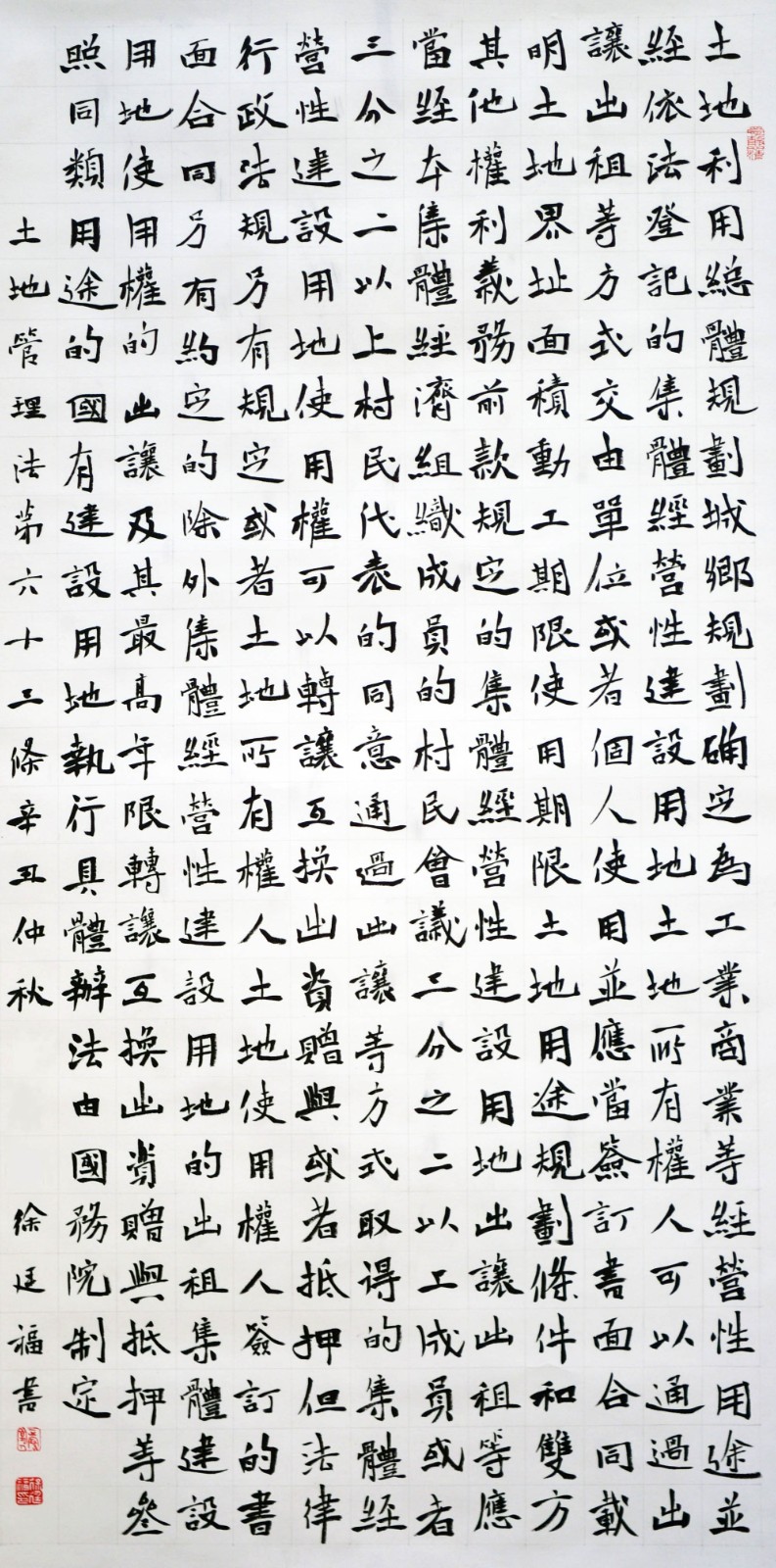 繼1600余位書(shū)法家參與書(shū)寫(xiě)《中華人民共和國(guó)民法典》全部1260條法條之后,法治日?qǐng)?bào)社聯(lián)合自然資源部法規(guī)司、自然資源部書(shū)畫(huà)研究會(huì)和北京昌平書(shū)法家協(xié)會(huì),將筆端對(duì)準(zhǔn)土地管理“一法一條例”,即《中華人民共和國(guó)土地管理法》和《中華人民共和國(guó)土地管理法實(shí)施條例》。