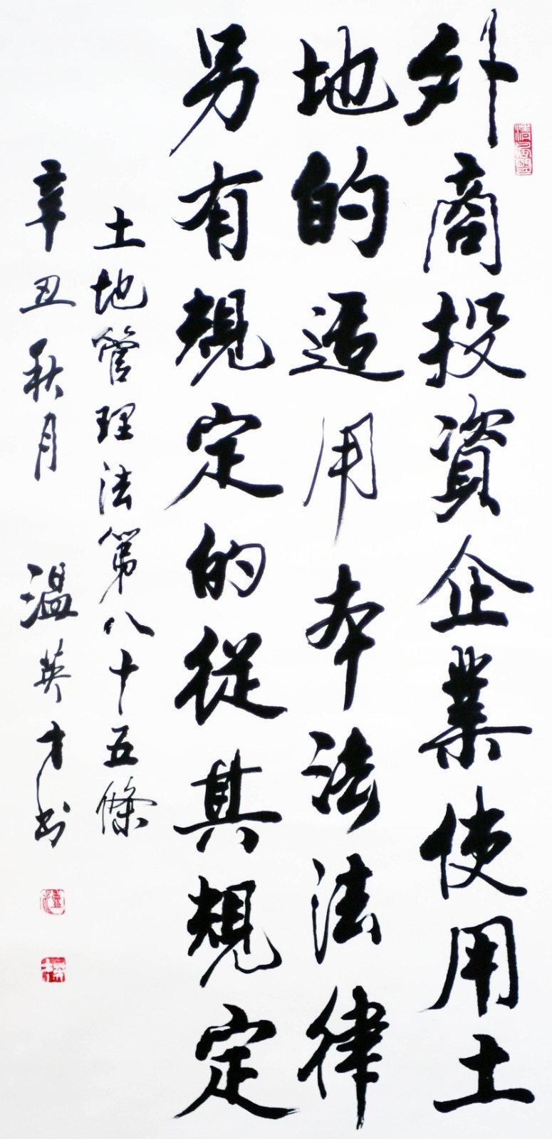 繼1600余位書法家參與書寫《中華人民共和國民法典》全部1260條法條之后,法治日?qǐng)?bào)社聯(lián)合自然資源部法規(guī)司、自然資源部書畫研究會(huì)和北京昌平書法家協(xié)會(huì),將筆端對(duì)準(zhǔn)土地管理“一法一條例”,即《中華人民共和國土地管理法》和《中華人民共和國土地管理法實(shí)施條例》。
