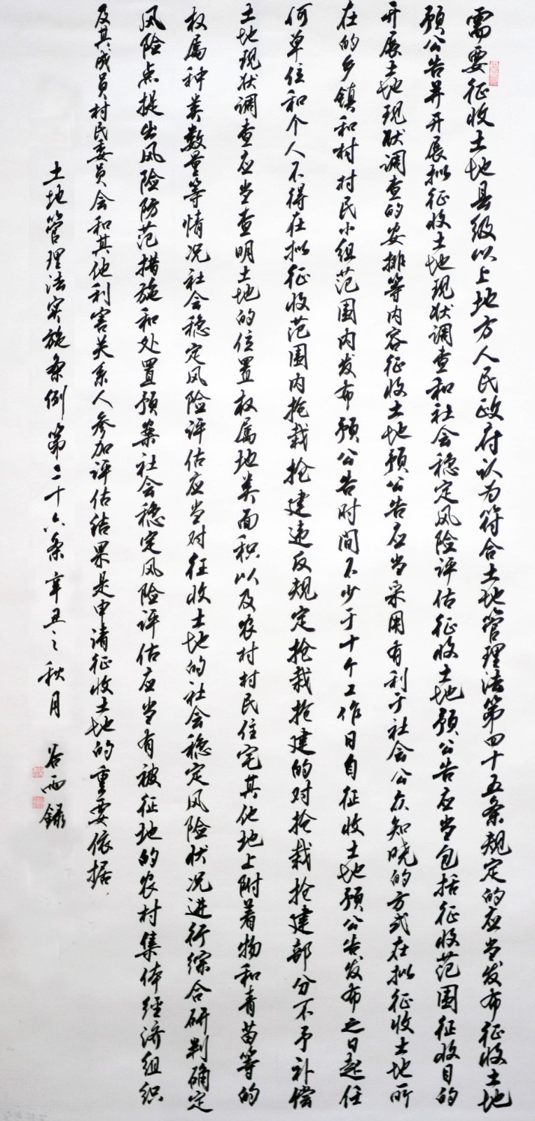 繼1600余位書法家參與書寫《中華人民共和國民法典》全部1260條法條之后,法治日報社聯(lián)合自然資源部法規(guī)司、自然資源部書畫研究會和北京昌平書法家協(xié)會,將筆端對準(zhǔn)土地管理“一法一條例”,即《中華人民共和國土地管理法》和《中華人民共和國土地管理法實施條例》。