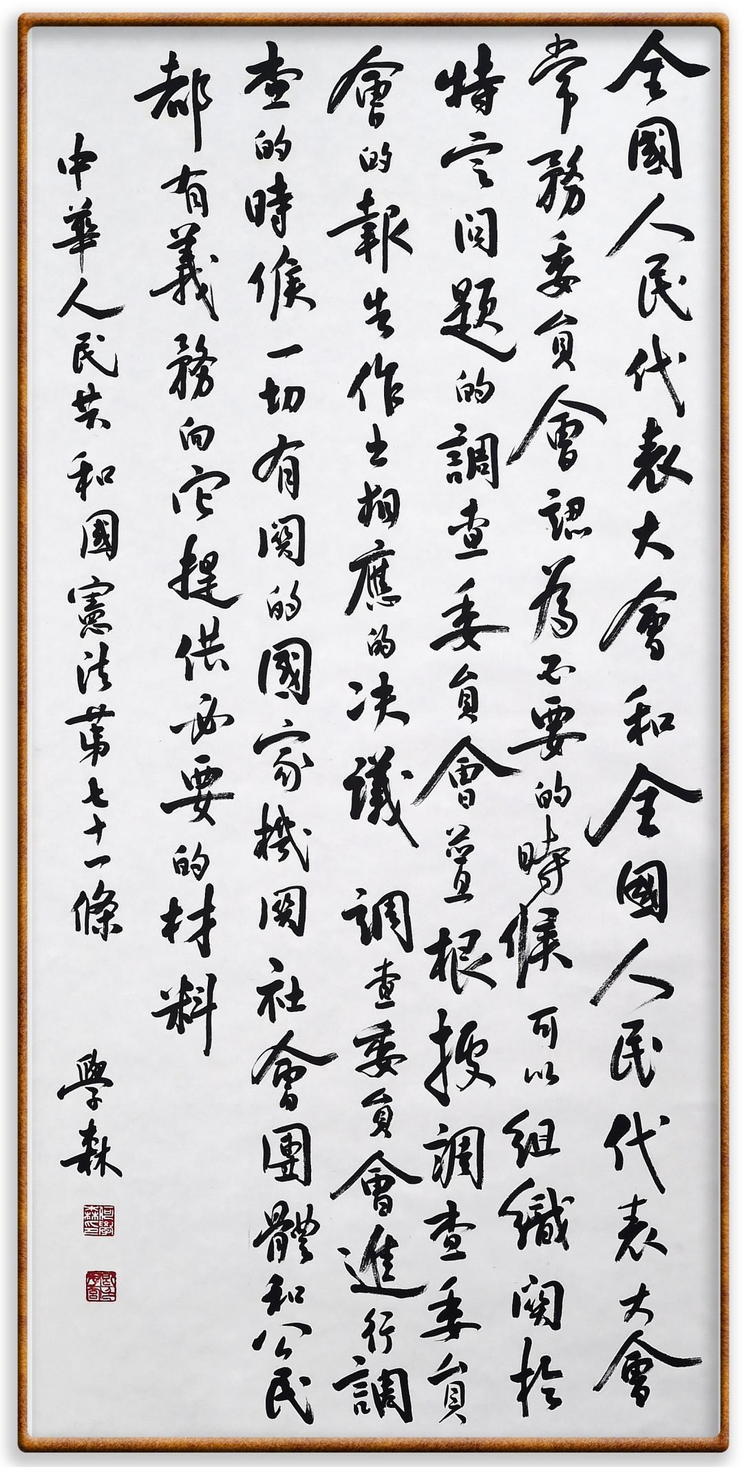 繼《中華人民共和國民法典》《中華人民共和國土地管理法》《中華人民共和國土地管理法實施條例》《中華人民共和國法律援助法》之后,法治日報社聯(lián)合北京市司法局、北京書法家協(xié)會,將筆端對準(zhǔn)《中華人民共和國憲法》和《中華人民共和國行政處罰法》。