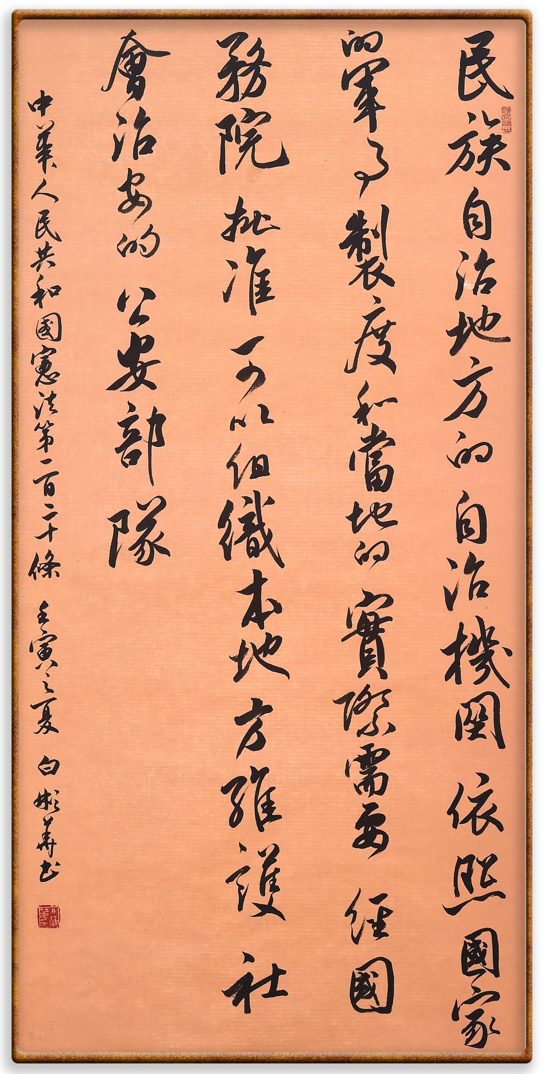 繼《中華人民共和國民法典》《中華人民共和國土地管理法》《中華人民共和國土地管理法實施條例》《中華人民共和國法律援助法》之后,法治日報社聯(lián)合北京市司法局、北京書法家協(xié)會,將筆端對準(zhǔn)《中華人民共和國憲法》和《中華人民共和國行政處罰法》。
