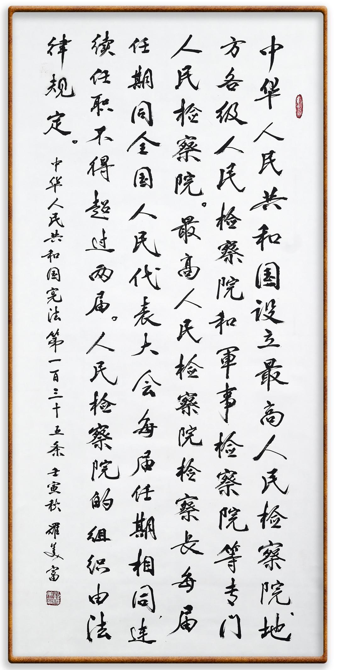 繼《中華人民共和國民法典》《中華人民共和國土地管理法》《中華人民共和國土地管理法實(shí)施條例》《中華人民共和國法律援助法》之后,法治日?qǐng)?bào)社聯(lián)合北京市司法局、北京書法家協(xié)會(huì),將筆端對(duì)準(zhǔn)《中華人民共和國憲法》和《中華人民共和國行政處罰法》。