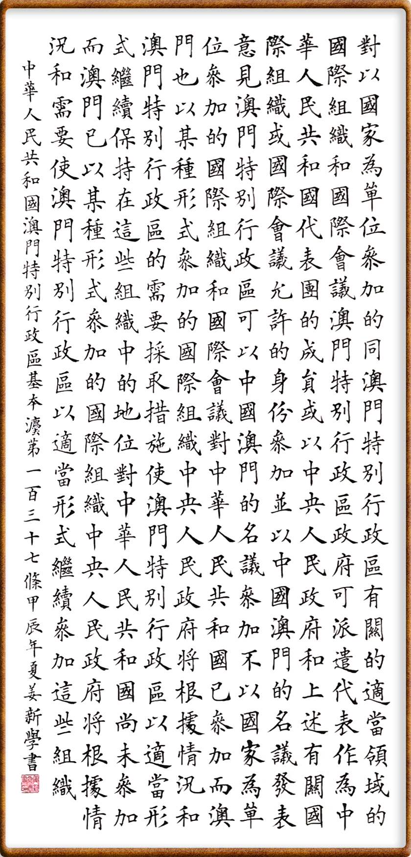 澳門基本法第一百三十七條 對以國家為單位參加的、同澳門特別行政區(qū)有關的、適當領域的國際組織和國際會議,澳門特別行政區(qū)政府可派遣代表作為中華人民共和國代表團的成員或以中央人民政府和上述有關國際組織或國際會議允許的身份參加,并以“中國澳門”的名義發(fā)表意見。