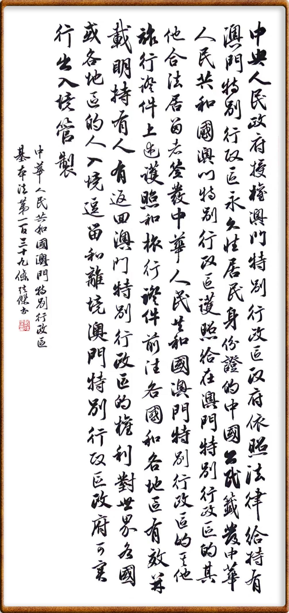 澳門基本法第一百三十九條 中央人民政府授權(quán)澳門特別行政區(qū)政府依照法律給持有澳門特別行政區(qū)永久性居民身份證的中國公民簽發(fā)中華人民共和國澳門特別行政區(qū)護(hù)照,給在澳門特別行政區(qū)的其他合法居留者簽發(fā)中華人民共和國澳門特別行政區(qū)的其他旅行證件。上述護(hù)照和旅行證件,前往各國和各地區(qū)有效,并載明持有人有返回澳門特別行政區(qū)的權(quán)利。