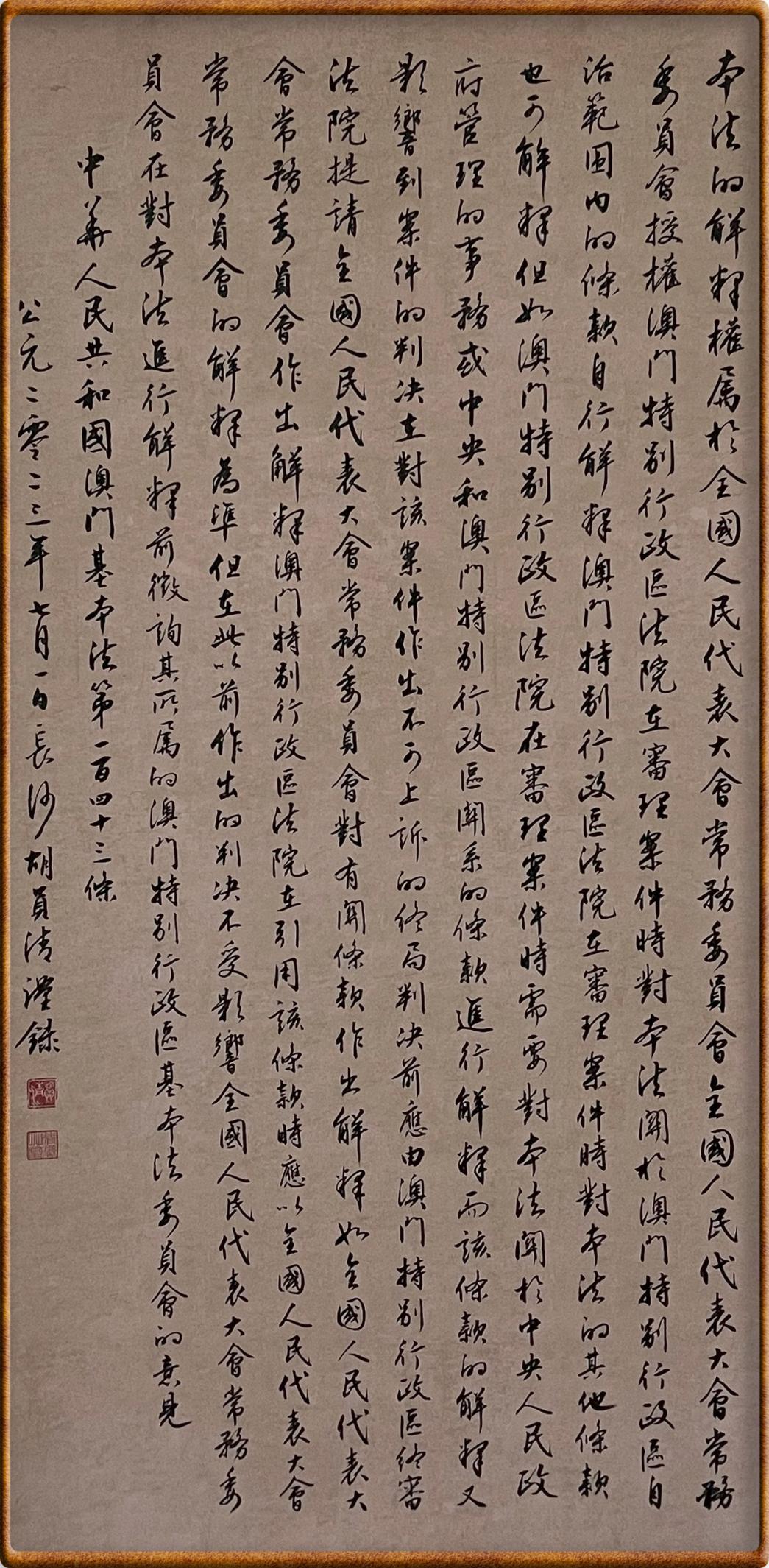 澳門基本法第一百四十三條 本法的解釋權(quán)屬于全國人民代表大會常務(wù)委員會。