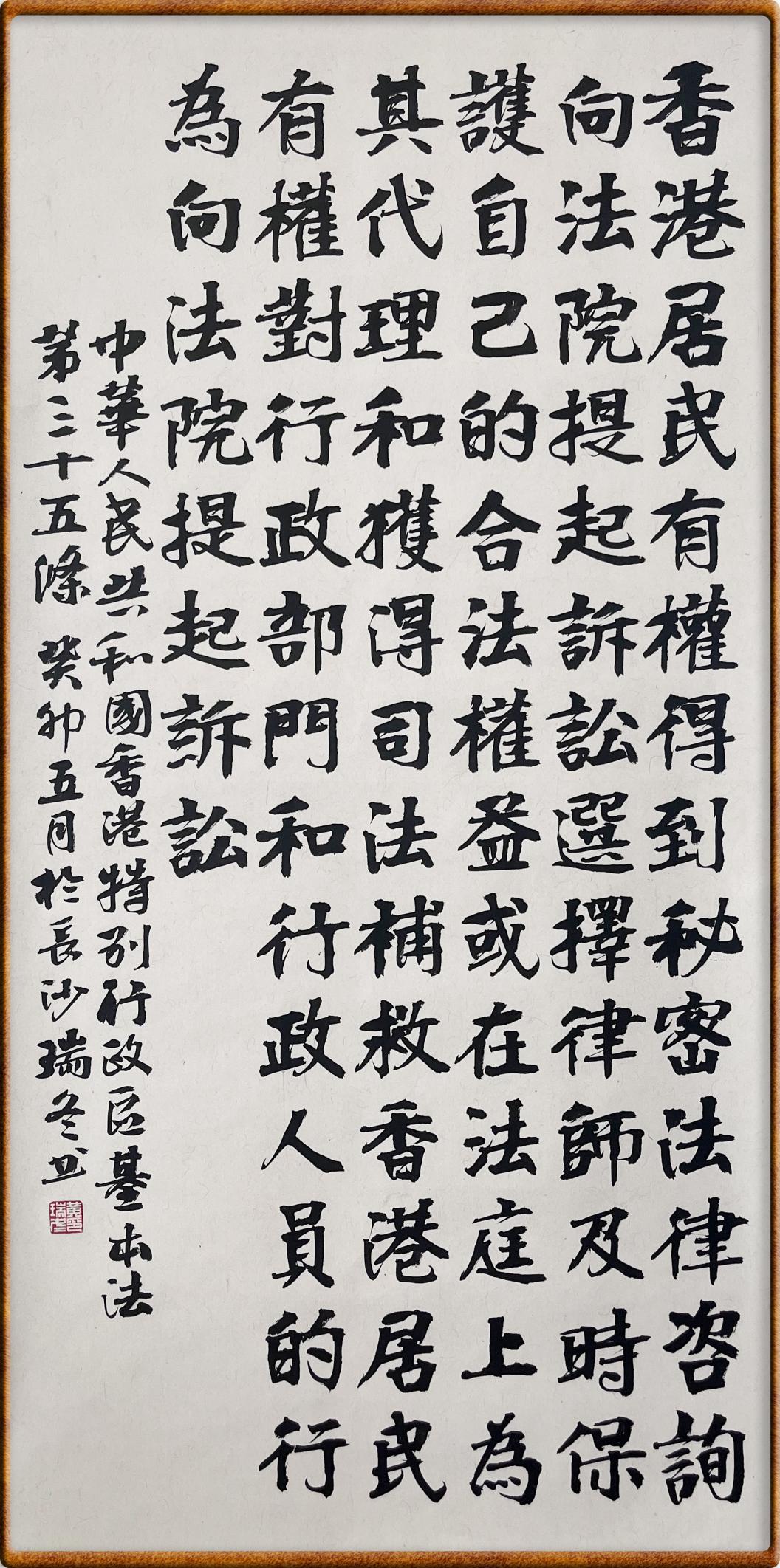 香港基本法第三十五條 香港居民有權(quán)得到秘密法律咨詢、向法院提起訴訟、選擇律師及時保護(hù)自己的合法權(quán)益或在法庭上為其代理和獲得司法補救。