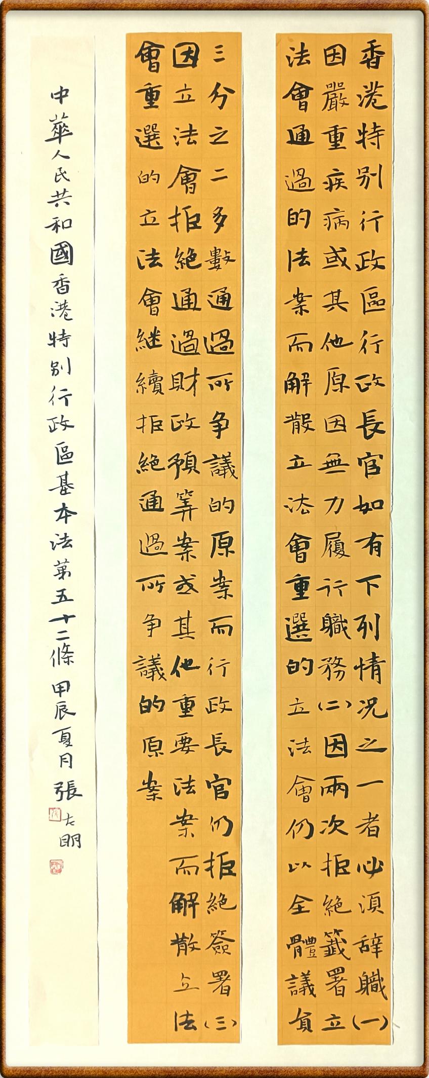 (二)因兩次拒絕簽署立法會通過的法案而解散立法會,重選的立法會仍以全體議員三分之二多數(shù)通過所爭議的原案,而行政長官仍拒絕簽署;