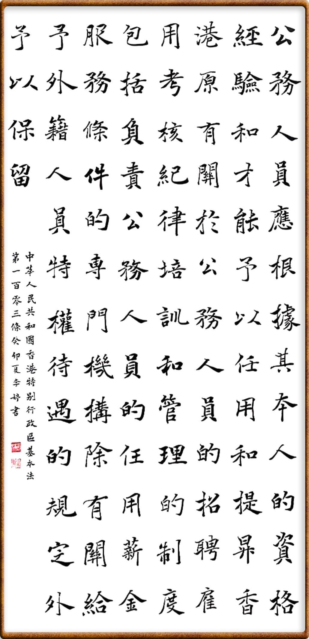 香港基本法第一百零三條 公務(wù)人員應(yīng)根據(jù)其本人的資格、經(jīng)驗(yàn)和才能予以任用和提升,香港原有關(guān)于公務(wù)人員的招聘、雇用、考核、紀(jì)律、培訓(xùn)和管理的制度,包括負(fù)責(zé)公務(wù)人員的任用、薪金、服務(wù)條件的專門機(jī)構(gòu),除有關(guān)給予外籍人員特權(quán)待遇的規(guī)定外,予以保留。