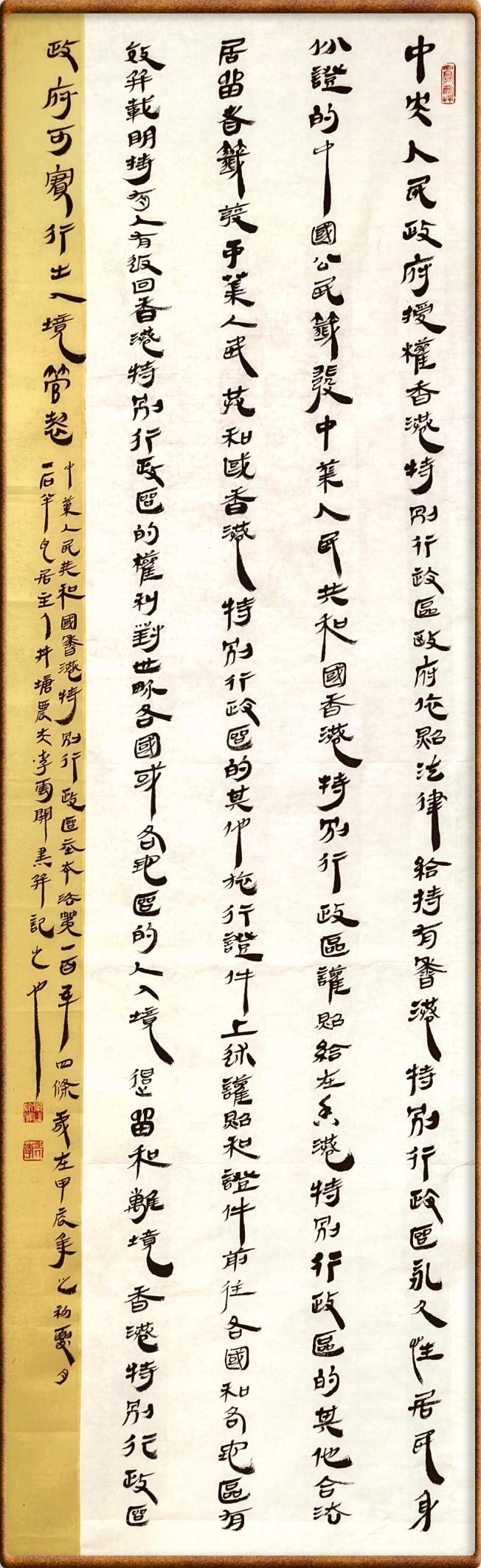香港基本法第一百五十四條 中央人民政府授權(quán)香港特別行政區(qū)政府依照法律給持有香港特別行政區(qū)永久性居民身份證的中國公民簽發(fā)中華人民共和國香港特別行政區(qū)護(hù)照,給在香港特別行政區(qū)的其他合法居留者簽發(fā)中華人民共和國香港特別行政區(qū)的其他旅行證件。上述護(hù)照和證件,前往各國和各地區(qū)有效,并載明持有人有返回香港特別行政區(qū)的權(quán)利。