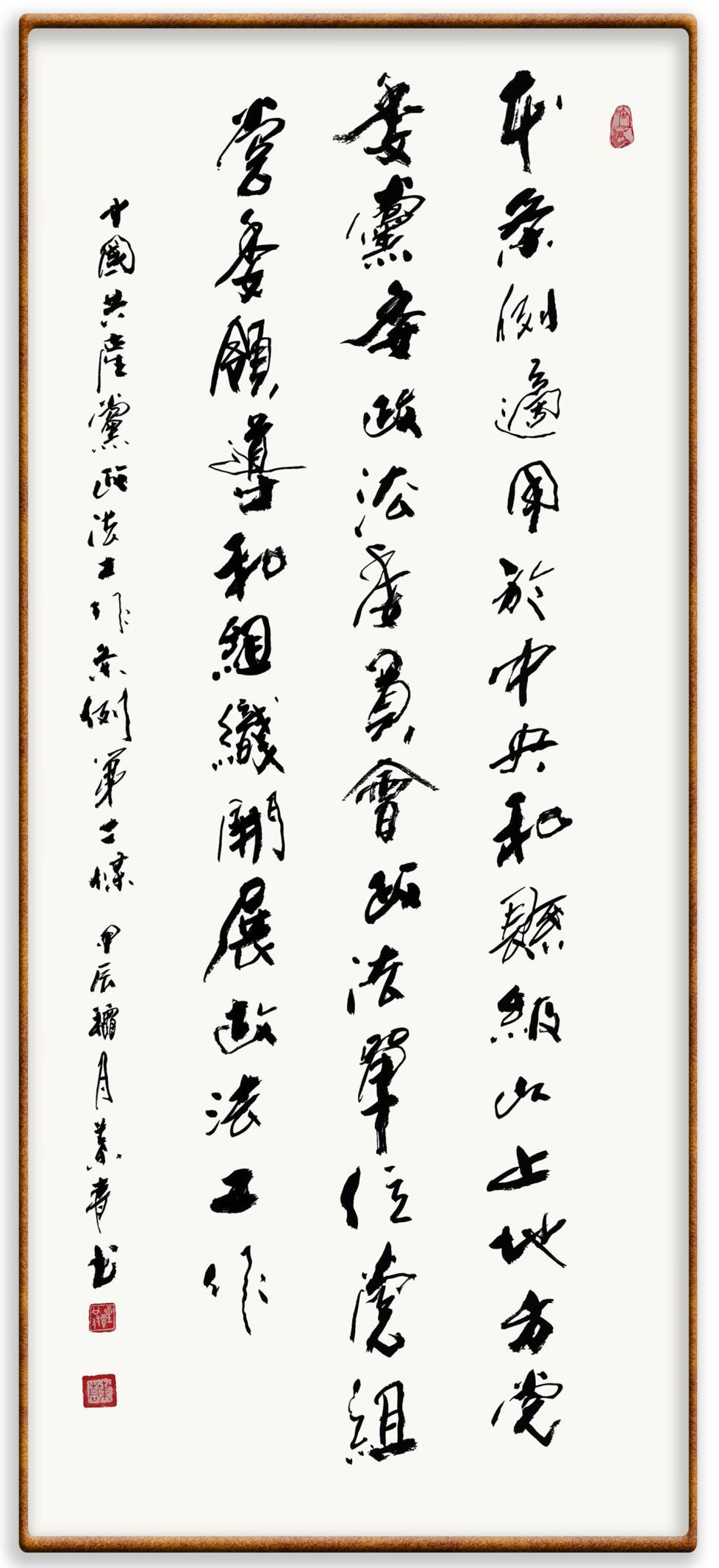 《中國(guó)共產(chǎn)黨政法工作條例》對(duì)黨領(lǐng)導(dǎo)新時(shí)代政法工作進(jìn)行全面制度擘畫(huà),為黨領(lǐng)導(dǎo)政法工作提供基本遵循,具有重大而深遠(yuǎn)的意義。為學(xué)習(xí)好、宣傳好、貫徹好、實(shí)施好這部黨內(nèi)法規(guī),繼《中華人民共和國(guó)民法典》《中華人民共和國(guó)憲法》《信訪工作條例》《中華人民共和國(guó)澳門(mén)特別行政區(qū)基本法》《中華人民共和國(guó)香港特別行政區(qū)基本法》等法律法規(guī)之后,“書(shū)·法”系列活動(dòng)將筆端對(duì)準(zhǔn)《中國(guó)共產(chǎn)黨政法工作條例》。