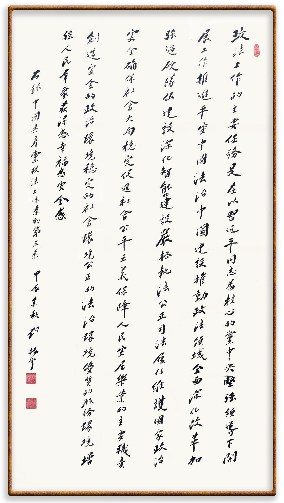《中國共產(chǎn)黨政法工作條例》對黨領導新時代政法工作進行全面制度擘畫,為黨領導政法工作提供基本遵循,具有重大而深遠的意義。為學習好、宣傳好、貫徹好、實施好這部黨內(nèi)法規(guī),繼《中華人民共和國民法典》《中華人民共和國憲法》《信訪工作條例》《中華人民共和國澳門特別行政區(qū)基本法》《中華人民共和國香港特別行政區(qū)基本法》等法律法規(guī)之后,“書·法”系列活動將筆端對準《中國共產(chǎn)黨政法工作條例》。
