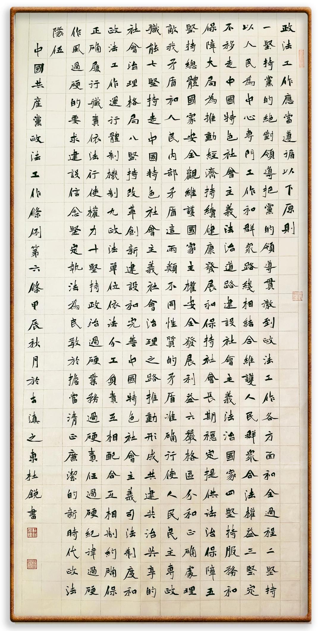 《中國共產(chǎn)黨政法工作條例》對黨領(lǐng)導新時代政法工作進行全面制度擘畫,為黨領(lǐng)導政法工作提供基本遵循,具有重大而深遠的意義。為學習好、宣傳好、貫徹好、實施好這部黨內(nèi)法規(guī),繼《中華人民共和國民法典》《中華人民共和國憲法》《信訪工作條例》《中華人民共和國澳門特別行政區(qū)基本法》《中華人民共和國香港特別行政區(qū)基本法》等法律法規(guī)之后,“書·法”系列活動將筆端對準《中國共產(chǎn)黨政法工作條例》。