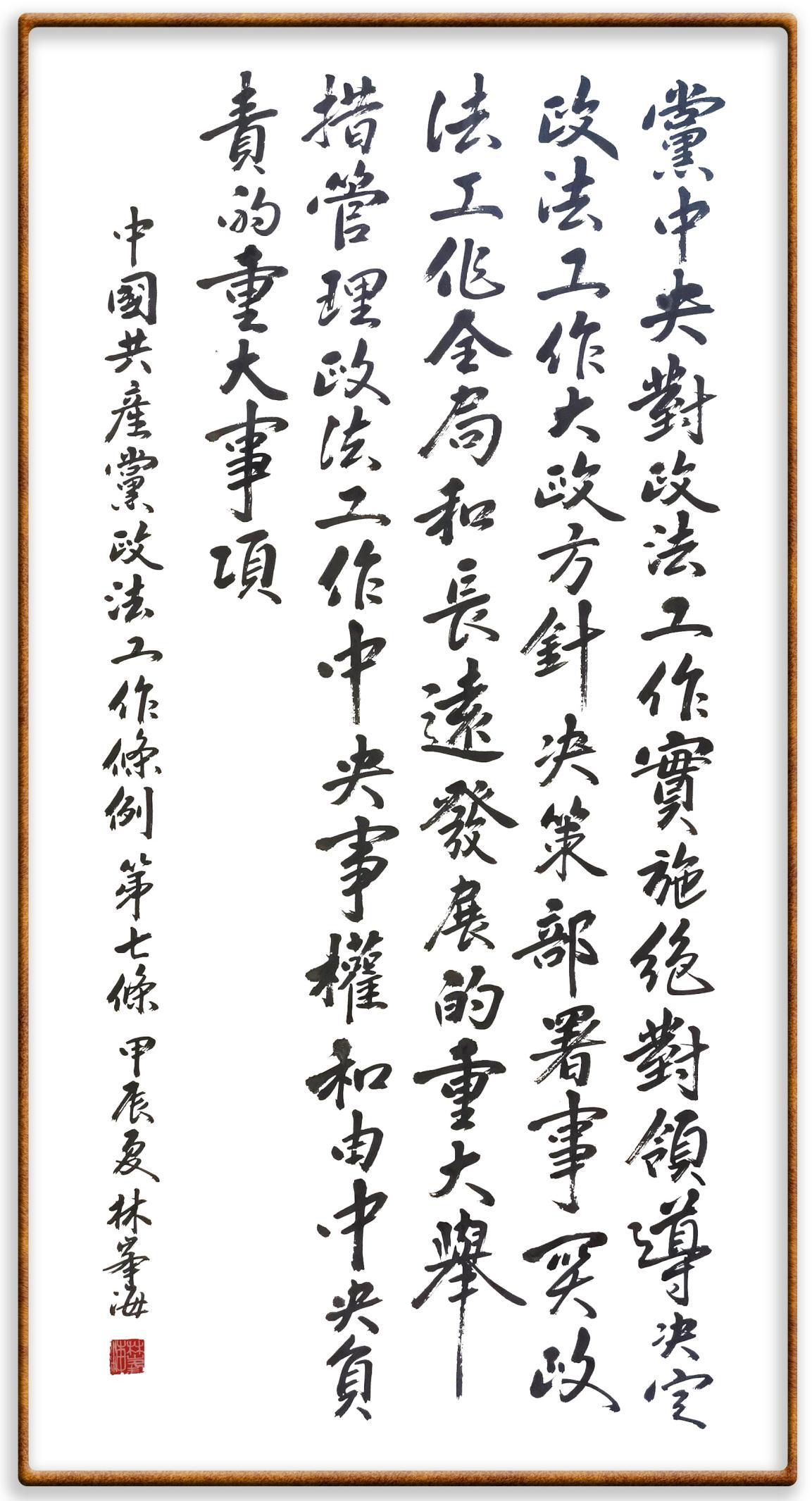 《中國共產(chǎn)黨政法工作條例》對黨領(lǐng)導(dǎo)新時代政法工作進(jìn)行全面制度擘畫,為黨領(lǐng)導(dǎo)政法工作提供基本遵循,具有重大而深遠(yuǎn)的意義。為學(xué)習(xí)好、宣傳好、貫徹好、實(shí)施好這部黨內(nèi)法規(guī),繼《中華人民共和國民法典》《中華人民共和國憲法》《信訪工作條例》《中華人民共和國澳門特別行政區(qū)基本法》《中華人民共和國香港特別行政區(qū)基本法》等法律法規(guī)之后,“書·法”系列活動將筆端對準(zhǔn)《中國共產(chǎn)黨政法工作條例》。