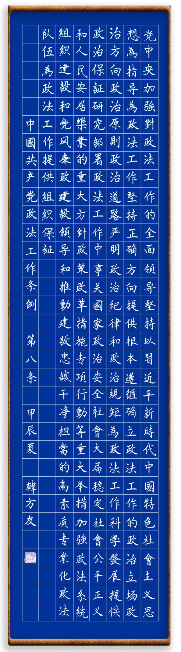 《中國共產(chǎn)黨政法工作條例》對黨領(lǐng)導(dǎo)新時代政法工作進行全面制度擘畫,為黨領(lǐng)導(dǎo)政法工作提供基本遵循,具有重大而深遠的意義。為學(xué)習(xí)好、宣傳好、貫徹好、實施好這部黨內(nèi)法規(guī),繼《中華人民共和國民法典》《中華人民共和國憲法》《信訪工作條例》《中華人民共和國澳門特別行政區(qū)基本法》《中華人民共和國香港特別行政區(qū)基本法》等法律法規(guī)之后,“書·法”系列活動將筆端對準《中國共產(chǎn)黨政法工作條例》。