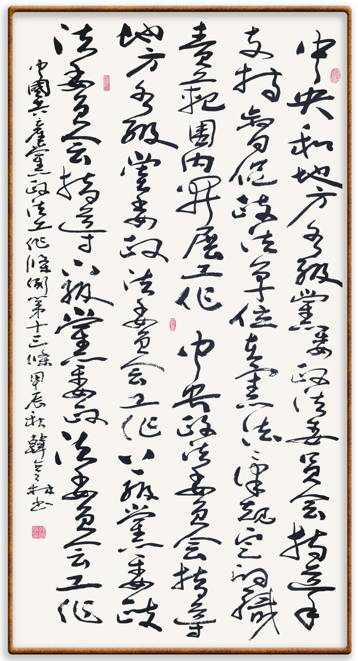 《中國共產(chǎn)黨政法工作條例》對黨領(lǐng)導(dǎo)新時(shí)代政法工作進(jìn)行全面制度擘畫,為黨領(lǐng)導(dǎo)政法工作提供基本遵循,具有重大而深遠(yuǎn)的意義。為學(xué)習(xí)好、宣傳好、貫徹好、實(shí)施好這部黨內(nèi)法規(guī),繼《中華人民共和國民法典》《中華人民共和國憲法》《信訪工作條例》《中華人民共和國澳門特別行政區(qū)基本法》《中華人民共和國香港特別行政區(qū)基本法》等法律法規(guī)之后,“書·法”系列活動(dòng)將筆端對準(zhǔn)《中國共產(chǎn)黨政法工作條例》。