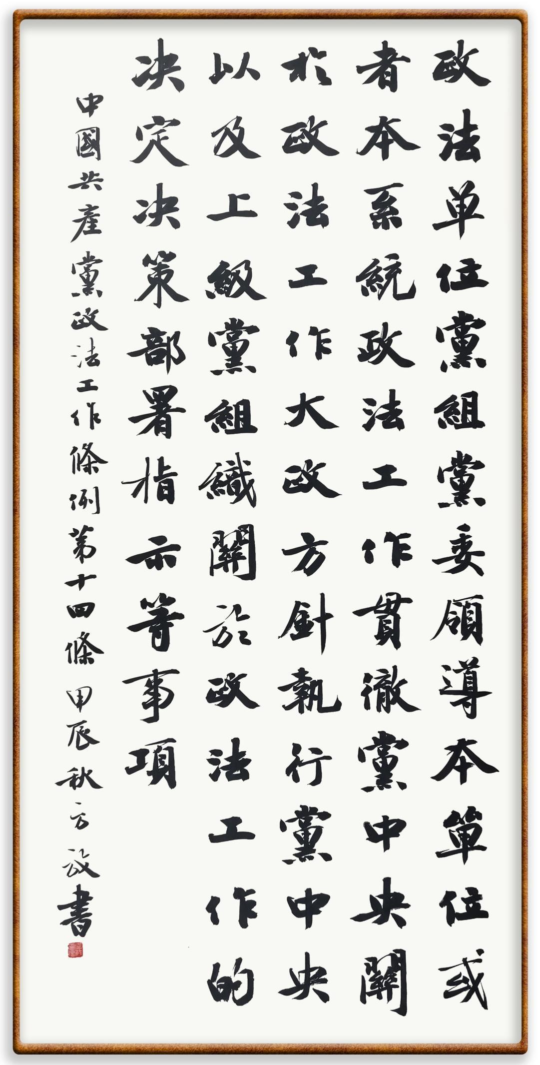 《中國共產(chǎn)黨政法工作條例》對黨領(lǐng)導(dǎo)新時代政法工作進行全面制度擘畫,為黨領(lǐng)導(dǎo)政法工作提供基本遵循,具有重大而深遠(yuǎn)的意義。為學(xué)習(xí)好、宣傳好、貫徹好、實施好這部黨內(nèi)法規(guī),繼《中華人民共和國民法典》《中華人民共和國憲法》《信訪工作條例》《中華人民共和國澳門特別行政區(qū)基本法》《中華人民共和國香港特別行政區(qū)基本法》等法律法規(guī)之后,“書·法”系列活動將筆端對準(zhǔn)《中國共產(chǎn)黨政法工作條例》。
