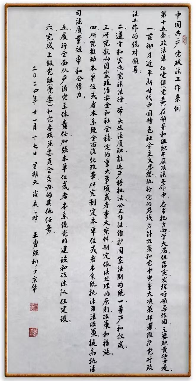 《中國共產(chǎn)黨政法工作條例》對黨領導新時代政法工作進行全面制度擘畫,為黨領導政法工作提供基本遵循,具有重大而深遠的意義。為學習好、宣傳好、貫徹好、實施好這部黨內(nèi)法規(guī),繼《中華人民共和國民法典》《中華人民共和國憲法》《信訪工作條例》《中華人民共和國澳門特別行政區(qū)基本法》《中華人民共和國香港特別行政區(qū)基本法》等法律法規(guī)之后,“書·法”系列活動將筆端對準《中國共產(chǎn)黨政法工作條例》。
