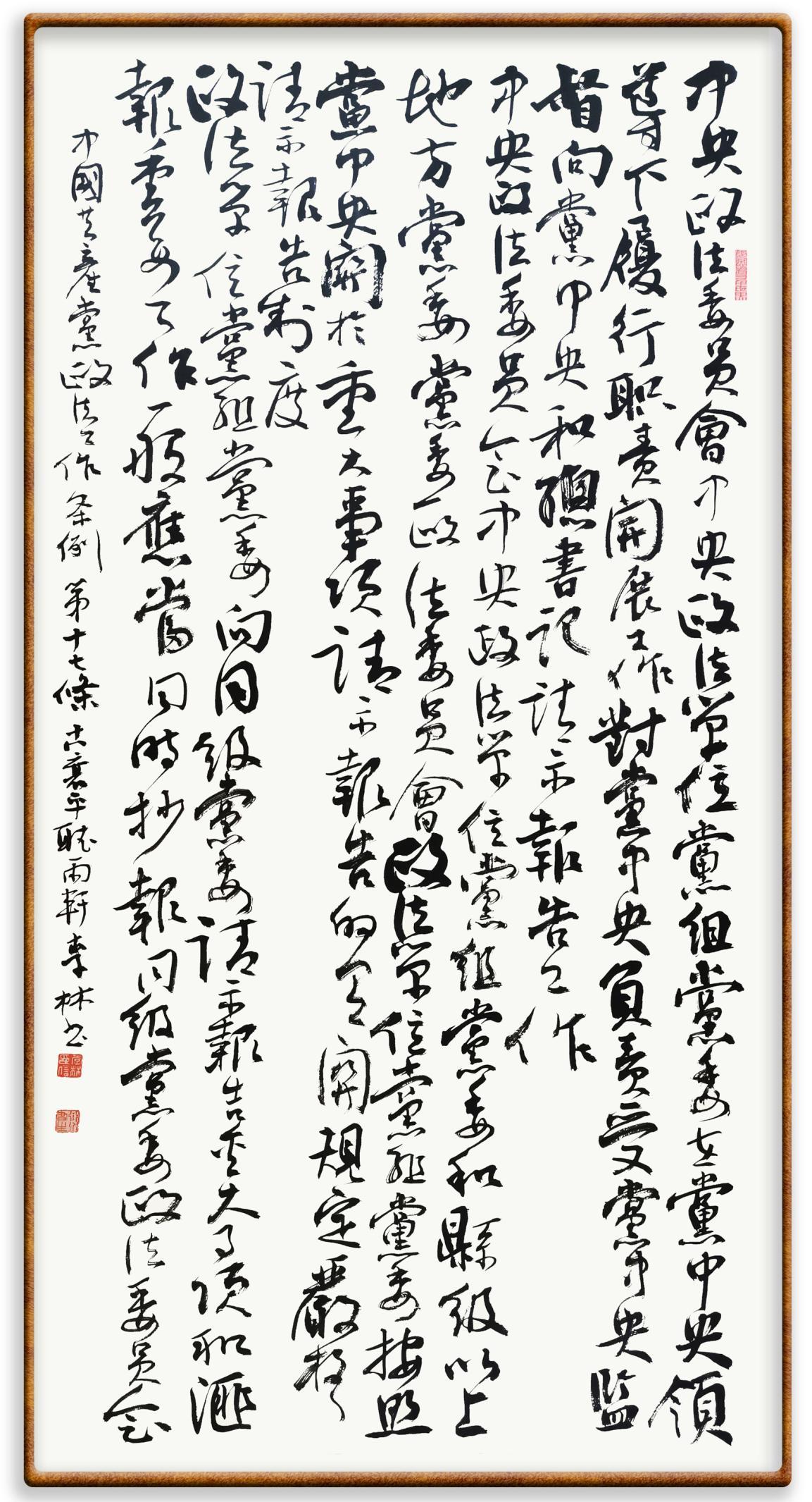 《中國(guó)共產(chǎn)黨政法工作條例》對(duì)黨領(lǐng)導(dǎo)新時(shí)代政法工作進(jìn)行全面制度擘畫,為黨領(lǐng)導(dǎo)政法工作提供基本遵循,具有重大而深遠(yuǎn)的意義。為學(xué)習(xí)好、宣傳好、貫徹好、實(shí)施好這部黨內(nèi)法規(guī),繼《中華人民共和國(guó)民法典》《中華人民共和國(guó)憲法》《信訪工作條例》《中華人民共和國(guó)澳門特別行政區(qū)基本法》《中華人民共和國(guó)香港特別行政區(qū)基本法》等法律法規(guī)之后,“書·法”系列活動(dòng)將筆端對(duì)準(zhǔn)《中國(guó)共產(chǎn)黨政法工作條例》。