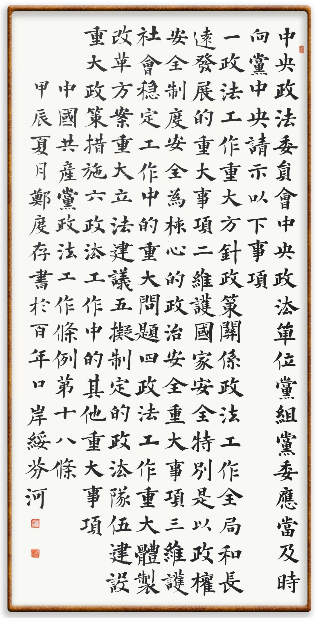 《中國共產黨政法工作條例》對黨領導新時代政法工作進行全面制度擘畫,為黨領導政法工作提供基本遵循,具有重大而深遠的意義。為學習好、宣傳好、貫徹好、實施好這部黨內法規(guī),繼《中華人民共和國民法典》《中華人民共和國憲法》《信訪工作條例》《中華人民共和國澳門特別行政區(qū)基本法》《中華人民共和國香港特別行政區(qū)基本法》等法律法規(guī)之后,“書·法”系列活動將筆端對準《中國共產黨政法工作條例》。