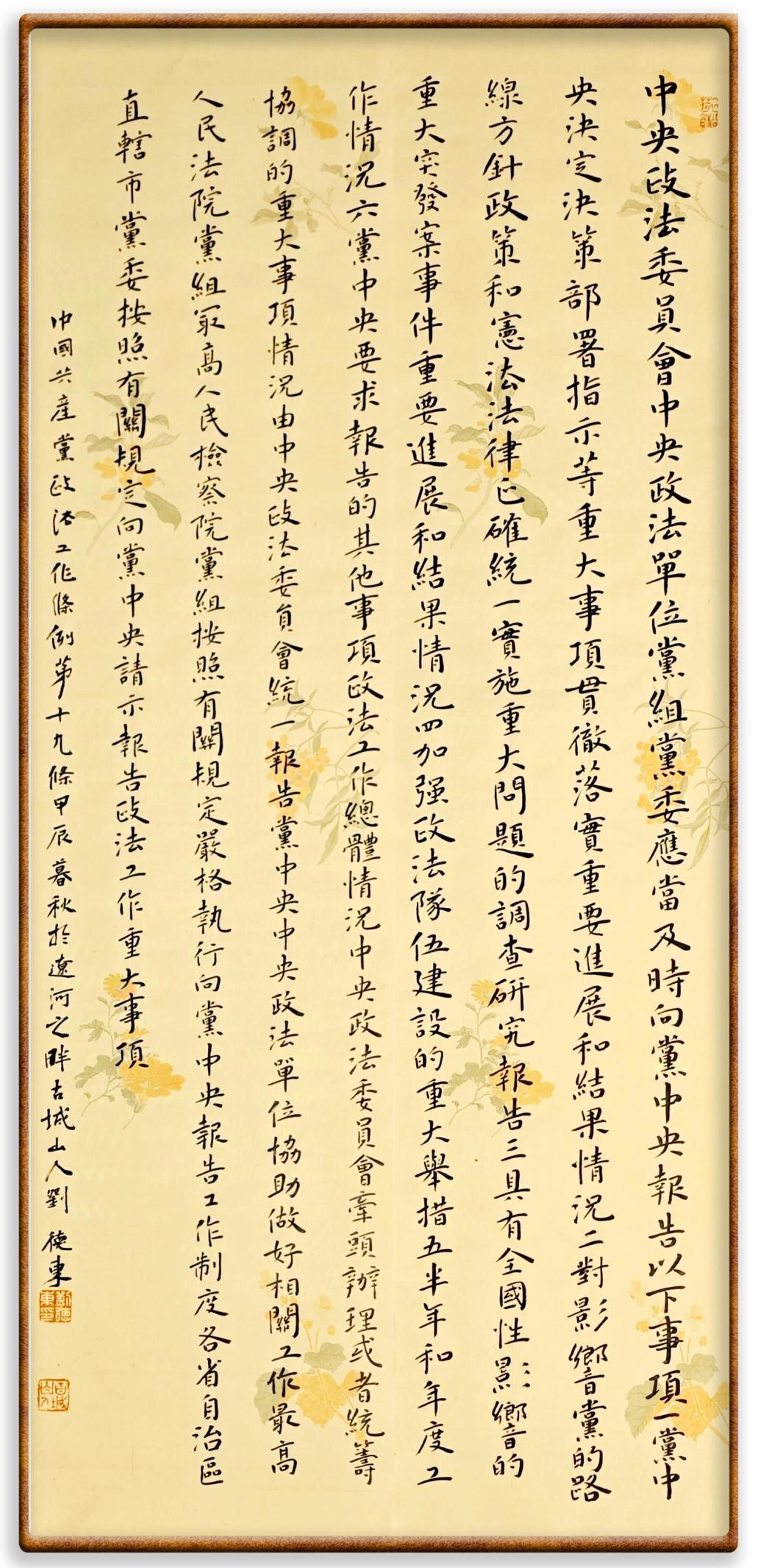 《中國(guó)共產(chǎn)黨政法工作條例》對(duì)黨領(lǐng)導(dǎo)新時(shí)代政法工作進(jìn)行全面制度擘畫,為黨領(lǐng)導(dǎo)政法工作提供基本遵循,具有重大而深遠(yuǎn)的意義。為學(xué)習(xí)好、宣傳好、貫徹好、實(shí)施好這部黨內(nèi)法規(guī),繼《中華人民共和國(guó)民法典》《中華人民共和國(guó)憲法》《信訪工作條例》《中華人民共和國(guó)澳門特別行政區(qū)基本法》《中華人民共和國(guó)香港特別行政區(qū)基本法》等法律法規(guī)之后,“書·法”系列活動(dòng)將筆端對(duì)準(zhǔn)《中國(guó)共產(chǎn)黨政法工作條例》。
