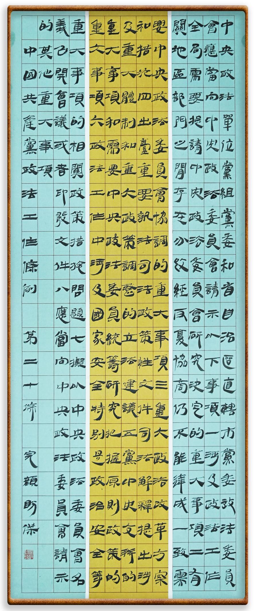 《中國共產(chǎn)黨政法工作條例》對黨領(lǐng)導(dǎo)新時代政法工作進行全面制度擘畫,為黨領(lǐng)導(dǎo)政法工作提供基本遵循,具有重大而深遠的意義。為學(xué)習(xí)好、宣傳好、貫徹好、實施好這部黨內(nèi)法規(guī),繼《中華人民共和國民法典》《中華人民共和國憲法》《信訪工作條例》《中華人民共和國澳門特別行政區(qū)基本法》《中華人民共和國香港特別行政區(qū)基本法》等法律法規(guī)之后,“書·法”系列活動將筆端對準《中國共產(chǎn)黨政法工作條例》。