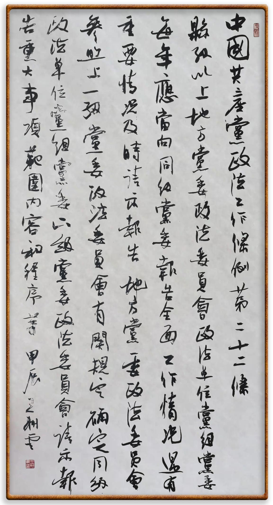 《中國共產黨政法工作條例》對黨領導新時代政法工作進行全面制度擘畫,為黨領導政法工作提供基本遵循,具有重大而深遠的意義。為學習好、宣傳好、貫徹好、實施好這部黨內法規(guī),繼《中華人民共和國民法典》《中華人民共和國憲法》《信訪工作條例》《中華人民共和國澳門特別行政區(qū)基本法》《中華人民共和國香港特別行政區(qū)基本法》等法律法規(guī)之后,“書·法”系列活動將筆端對準《中國共產黨政法工作條例》。