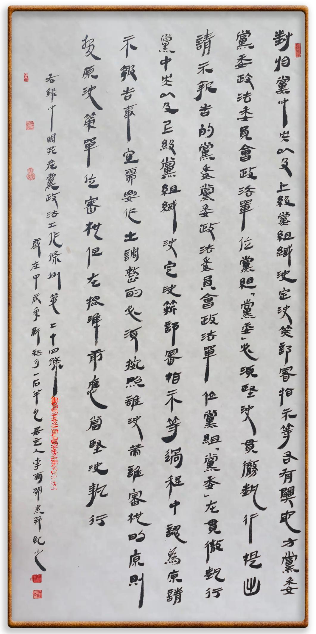 《中國(guó)共產(chǎn)黨政法工作條例》對(duì)黨領(lǐng)導(dǎo)新時(shí)代政法工作進(jìn)行全面制度擘畫,為黨領(lǐng)導(dǎo)政法工作提供基本遵循,具有重大而深遠(yuǎn)的意義。為學(xué)習(xí)好、宣傳好、貫徹好、實(shí)施好這部黨內(nèi)法規(guī),繼《中華人民共和國(guó)民法典》《中華人民共和國(guó)憲法》《信訪工作條例》《中華人民共和國(guó)澳門特別行政區(qū)基本法》《中華人民共和國(guó)香港特別行政區(qū)基本法》等法律法規(guī)之后,“書·法”系列活動(dòng)將筆端對(duì)準(zhǔn)《中國(guó)共產(chǎn)黨政法工作條例》。